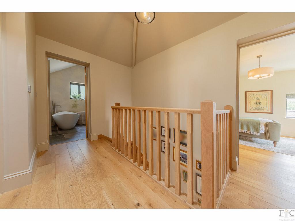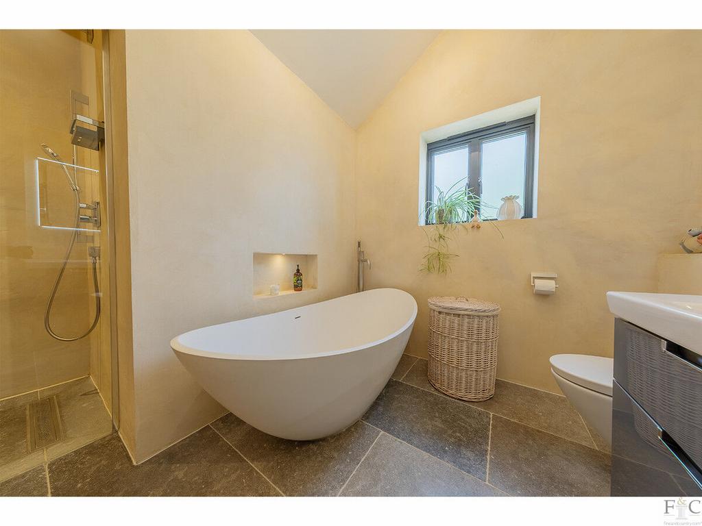 Upstairs, a galleried landing leads to three elegant, dual-aspect double bedrooms. The principal suite is a sanctuary of calm, complete with a fitted dressing room and a luxurious ensuite featuring venetian plaster walls, a freestanding bath and a double walk-in shower. A further family bathroom echoes the same elevated finishes and thoughtful design.