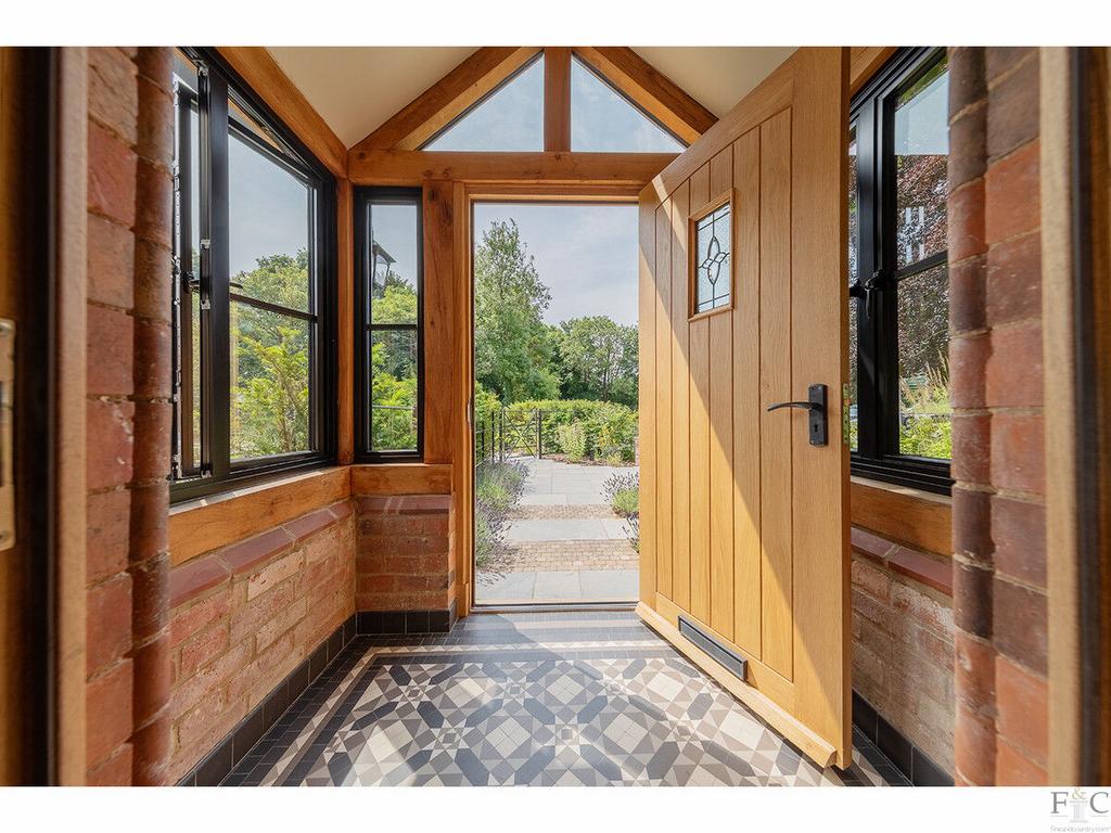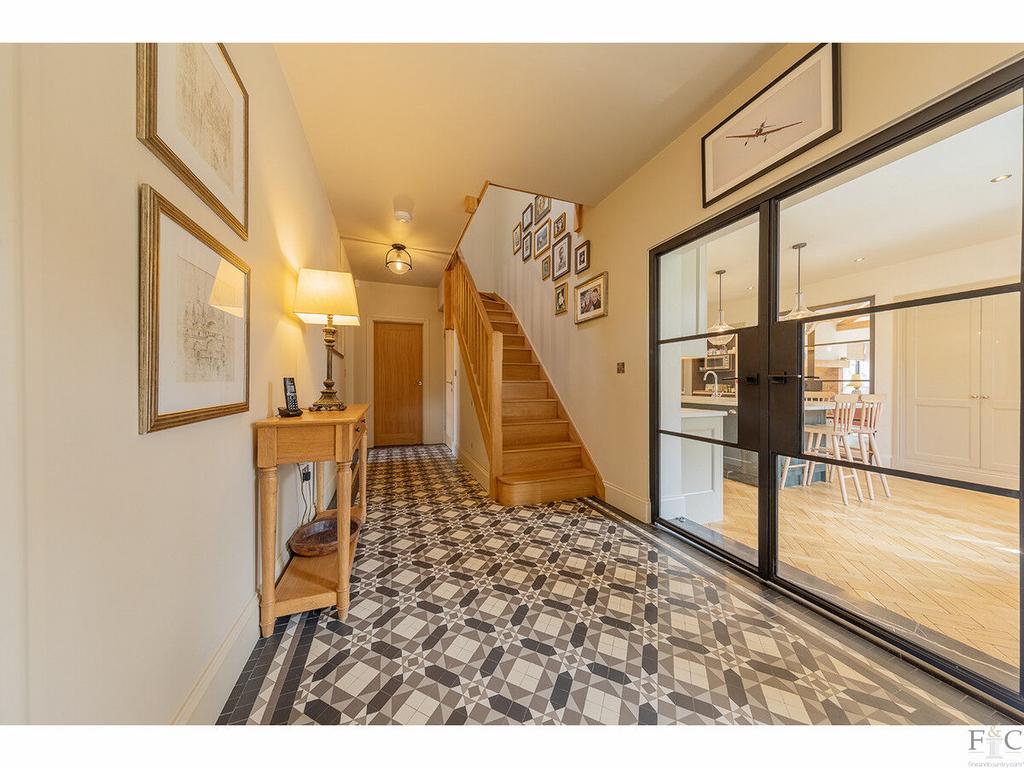 Nestled behind traditional estate fencing and native hedging, the house immediately impresses with its harmonious palette of exposed brick, soft render and graphite-framed windows. A handsome oak-framed storm porch opens into a stylish entrance hall, where a monochrome tiled floor and bespoke oak staircase hint at the craftsmanship to come. A guest cloakroom completes the space.