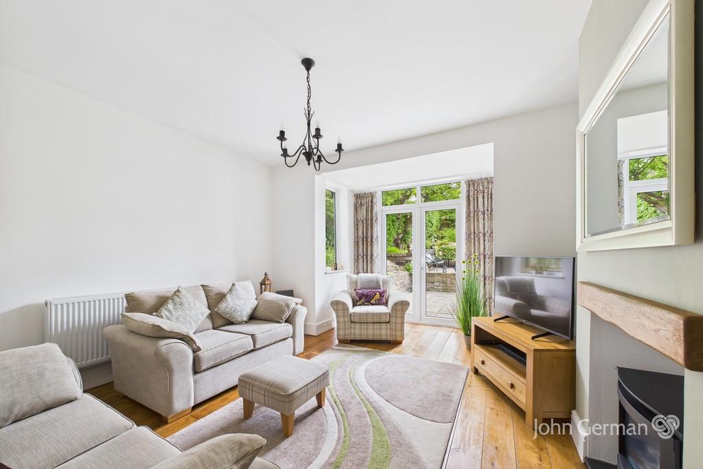 The elegant sitting room features a deep bay incorporating double French style doors which open to the rear terrace and garden, plus a recessed fireplace and wooden flooring.