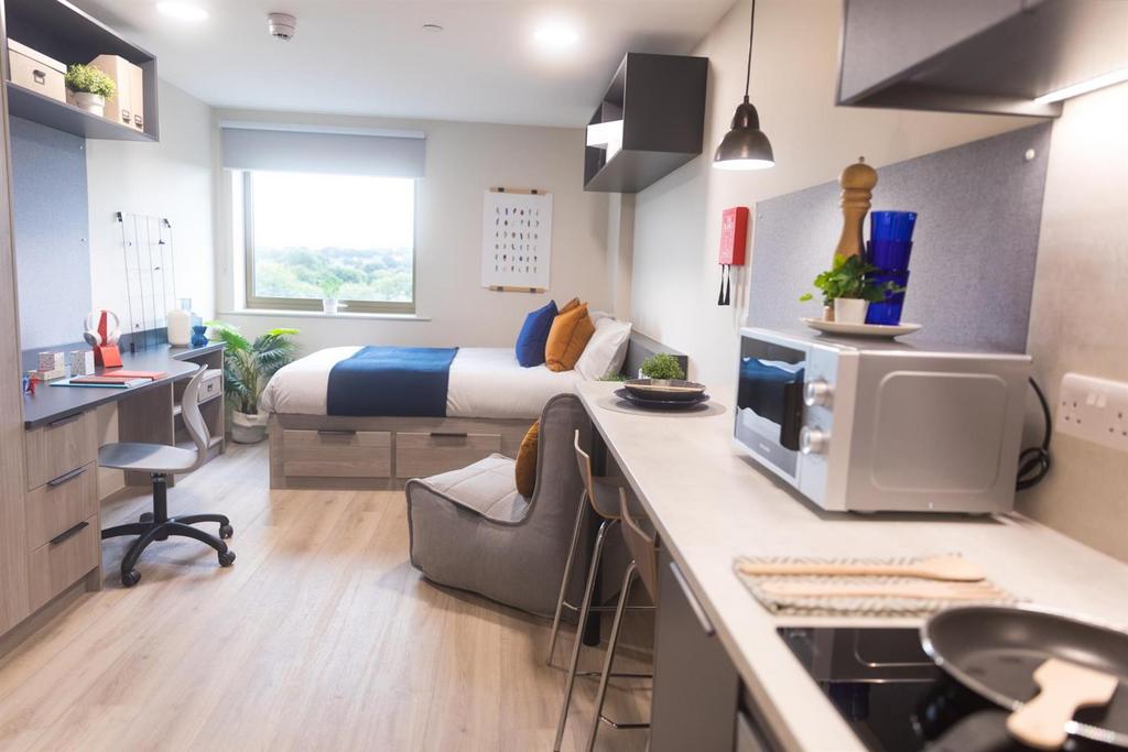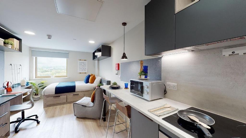 The building itself is thoughtfully designed with comfort and style in mind. A variety of high-spec studios and apartments are available to suit different lifestyles and budgets, from standard studios to deluxe and platinum options. Each living space comes fully furnished with private kitchenettes, study areas, storage, and modern en-suites, offering a self-contained, home-like feel.