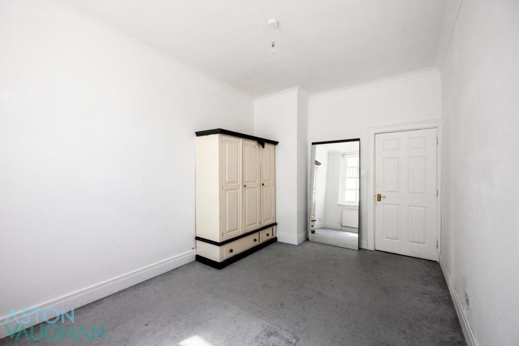 Stepping inside the apartment, there is a useful cloakroom/WC and a door opening to the incredible, open plan living room and kitchen. It is breathtaking in scale with three tall sash windows on the easterly edge framing views over the nearby gardens to the sea. This room invites entertaining in style with ample space for sumptuous furnishings and a formal dining table and chairs alongside the kitchen. While the kitchen has been modernised in areas, it would be possible to add value with new cabinetry and appliances. The original character of the building has been retained within the cornicing, skirtings, dado and picture rails, while the overall aesthetic is simple and contemporary in white and grey to suit all styles of furnishing.