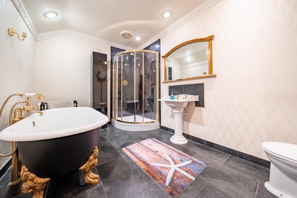 Each additional bedroom has its own unique charm, with character features including cast iron radiators, leaded windows with deep oak sills, and lofty ceilings. A second opulent family bathroom serves these rooms, similarly appointed with a roll-top bath, separate shower, and exquisite period detailing.
