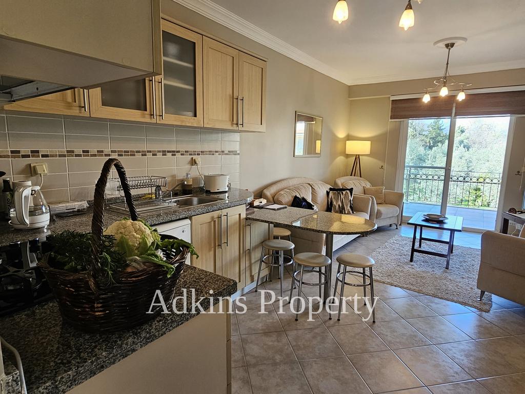 Positioned on the first and top floors, the apartment includes a bright open-plan living space with a well-fitted cream kitchen, granite worktops, and a breakfast bar. The lounge opens onto a large dining terrace with a built-in BBQ and garden/mountain views.