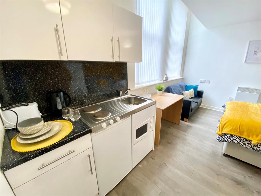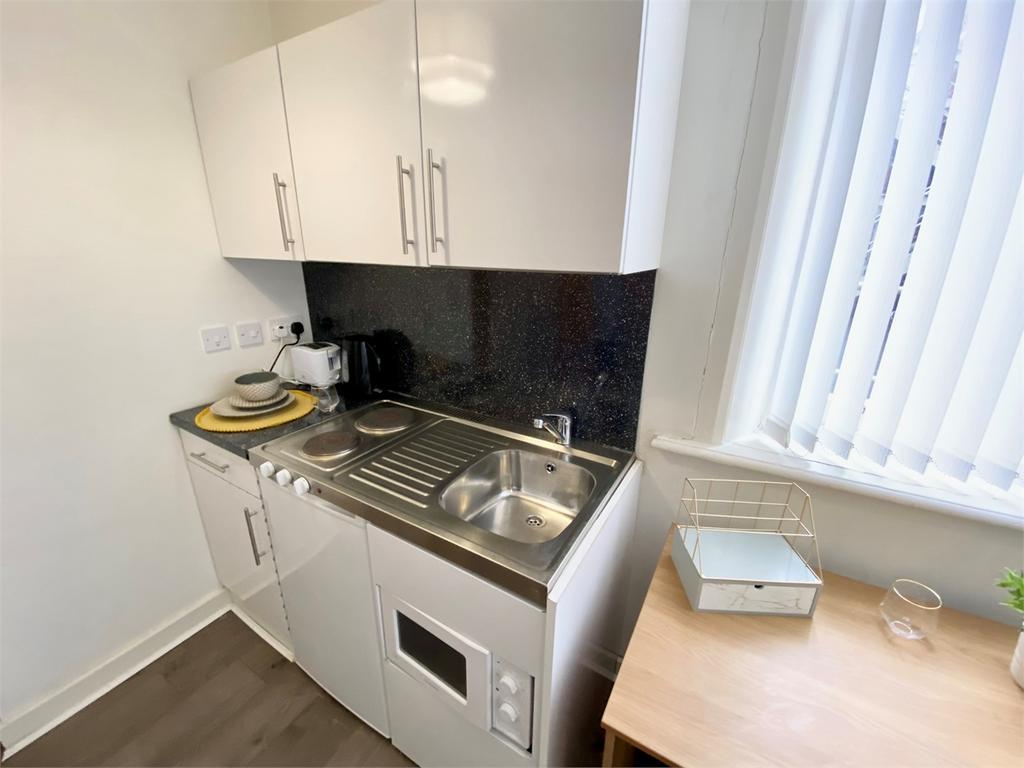 With kitchen area with fitted cabinets, sink and drainer, built in microwave, fridge with freezer box.