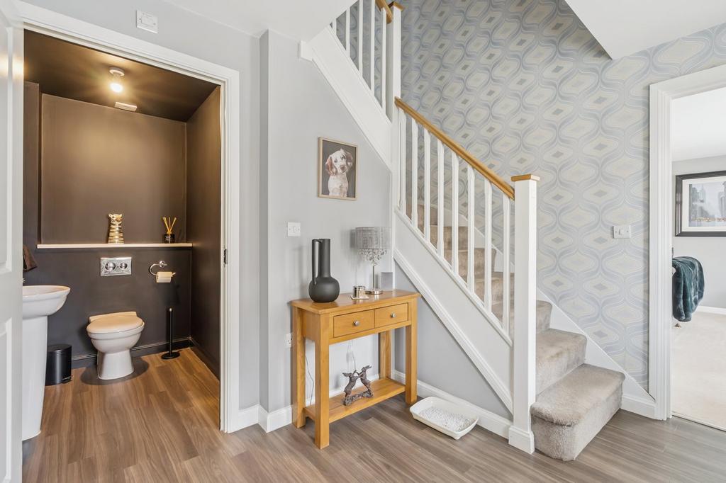 Entrance door with wing windows to side. Wood effect flooring. Radiator. Stairs leading to first floor. Doors leading to Dining room,cloakroom and lounge