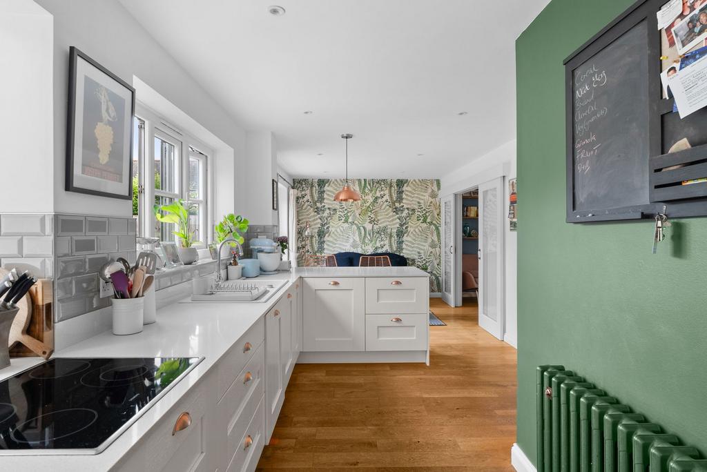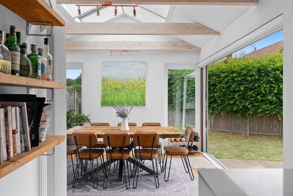 Upon entering the property, a useful entrance porch leads into a welcoming hallway with a cloakroom and stairs rising to the first floor. The sitting room lies to the front of the house, a generously proportioned space centred around a red brick fireplace with log burner and framed by a bay window drawing in natural light. A separate family room opens onto the rear garden via double doors, providing flexible space for everyday living or entertaining. To the front, a study offers a quiet and practical workspace and views to the village street. The stunning kitchen is fitted with an extensive range of shaker style units, integrated appliances including an induction hob, fridge, freezer, washing machine, dishwasher and built-in oven. Adjoining this is a magnificent, vaulted dining room, a standout feature of the home, with skylights and bi-folding doors opening to the rear garden — flooding the space with light and offering an ideal setting for family gatherings.