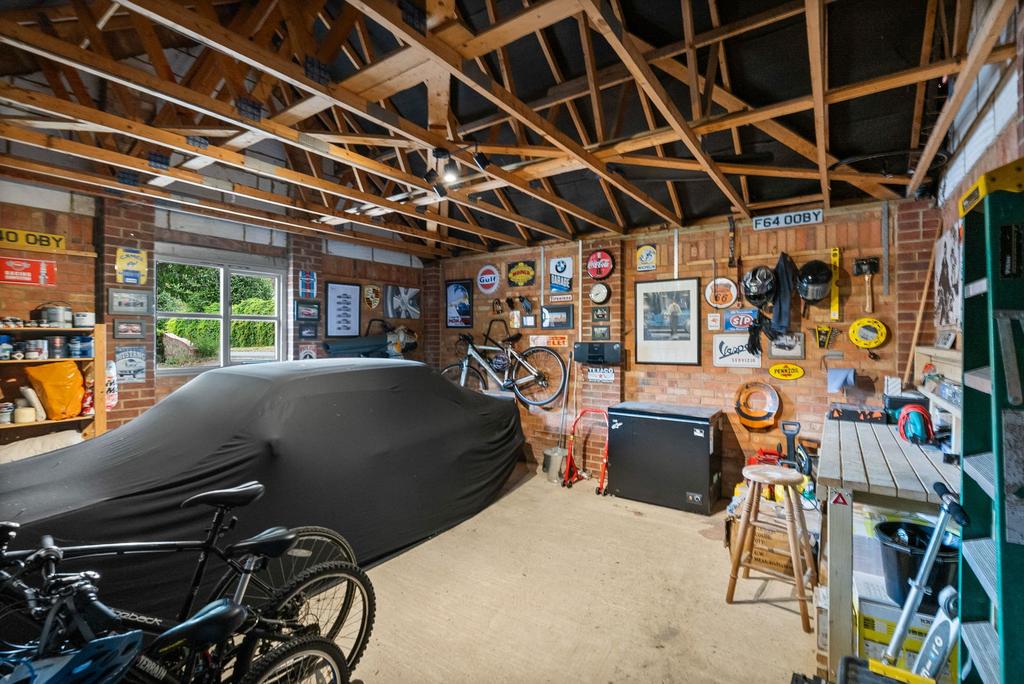 The property is approached via a block-paved driveway providing off-road parking for up to three vehicles and giving access to a generous double garage. Fitted with twin sets of double doors, power and lighting are connected. To the rear, the garden is enclosed by a charming flint wall and panel fencing making it a particularly attractive feature of the home — laid mainly to lawn with well-stocked flowerbeds, mature shrubs, and a variety of trees creating year-round interest. A timber garden shed offers useful storage.
