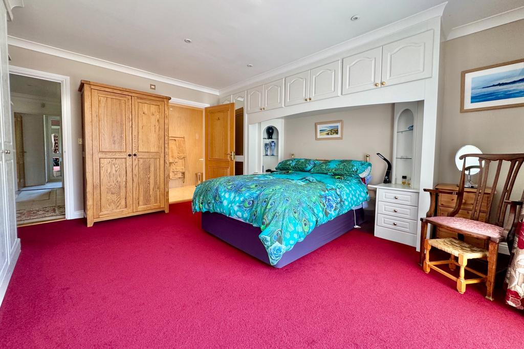 You are welcomed to Lorelei by the spacious and light entrance hall with light oak and glazed double doors leading to the living room. This is a generous, South facing room with an attractive Portland stone fireplace, with inset, contemporary gas fire. Sliding double doors open to the paved patio area at the front of the property. The open plan kitchen/dining room is fitted with an extensive range of contemporary units, marble worktops, integrated appliances, and has access to the paved patio and rear garden.