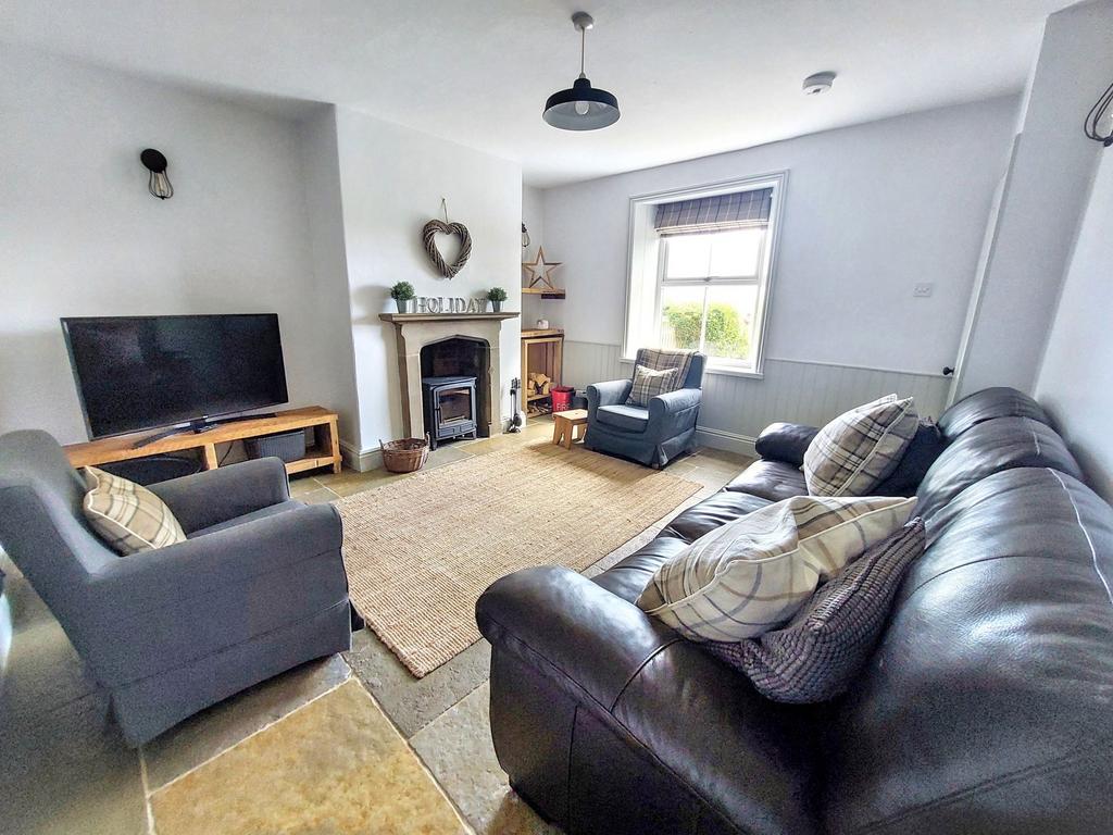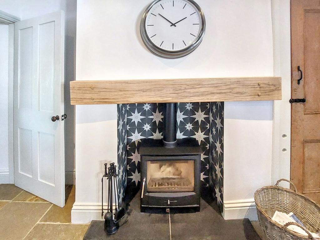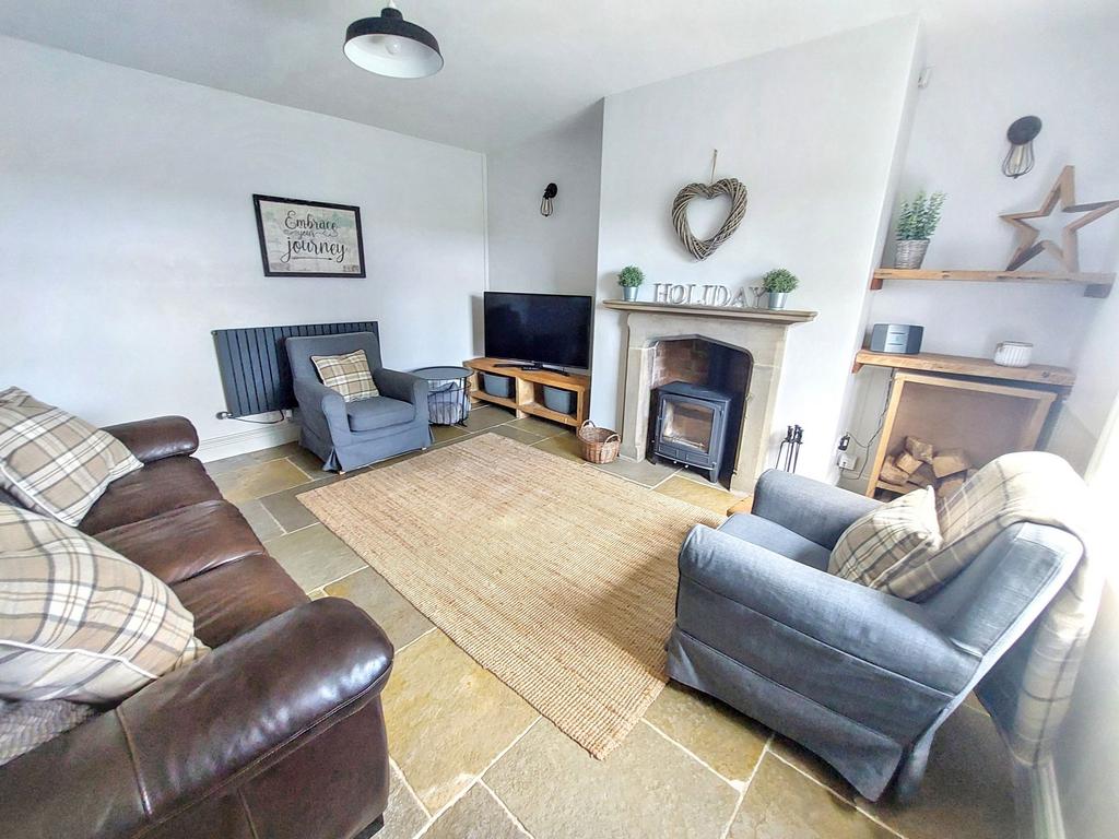 A cosy and inviting living room that blends traditional country charm with modern comfort. The room is anchored by a central fireplace with a rustic stone surround and a wood-burning stove, creating a warm and welcoming focal point.