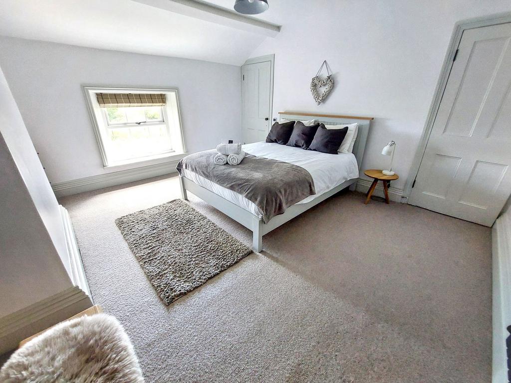 A charming traditional stone-built terraced cottage. Featuring a symmetrical façade with sash-style windows and pastel-coloured front door. The exterior exudes rustic appeal, enhanced by the natural stone construction and tidy architectural details. In front of the cottage lies a well-maintained lawn bordered by a fence, with mature shrubs, flowering plants like lavender, and a wooden bench adding to the idyllic, countryside atmosphere. The perfect setting in a rural environment with a welcoming and homely feel.