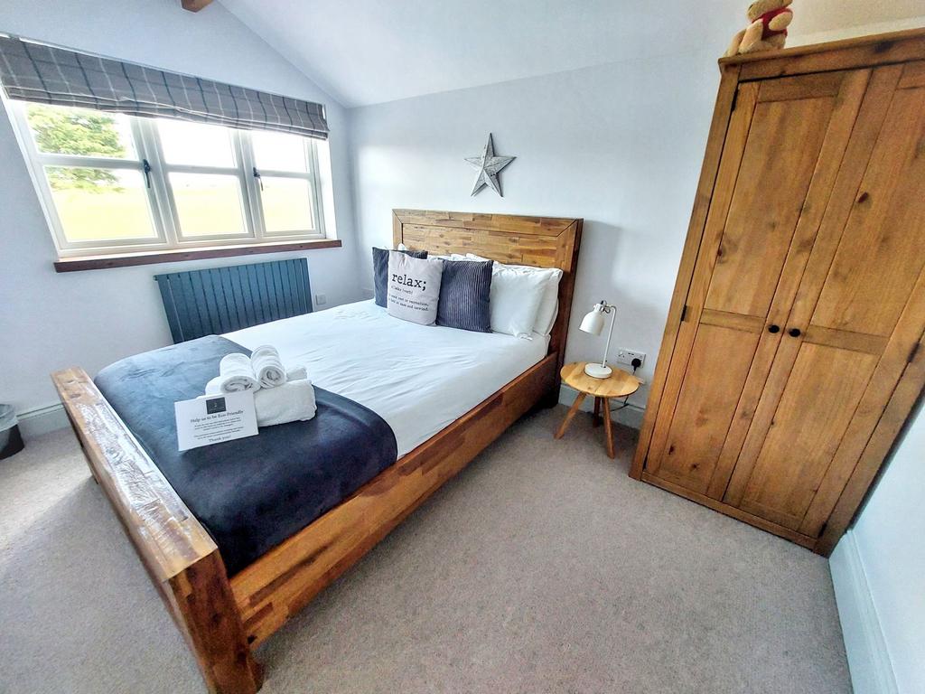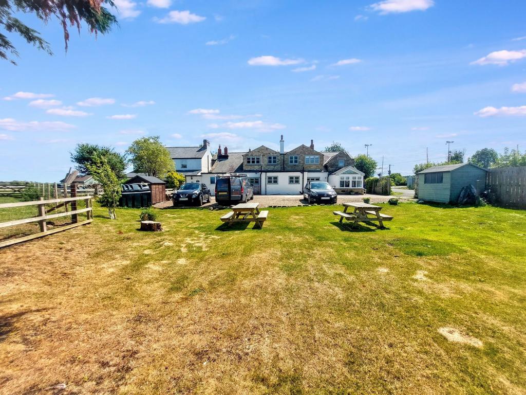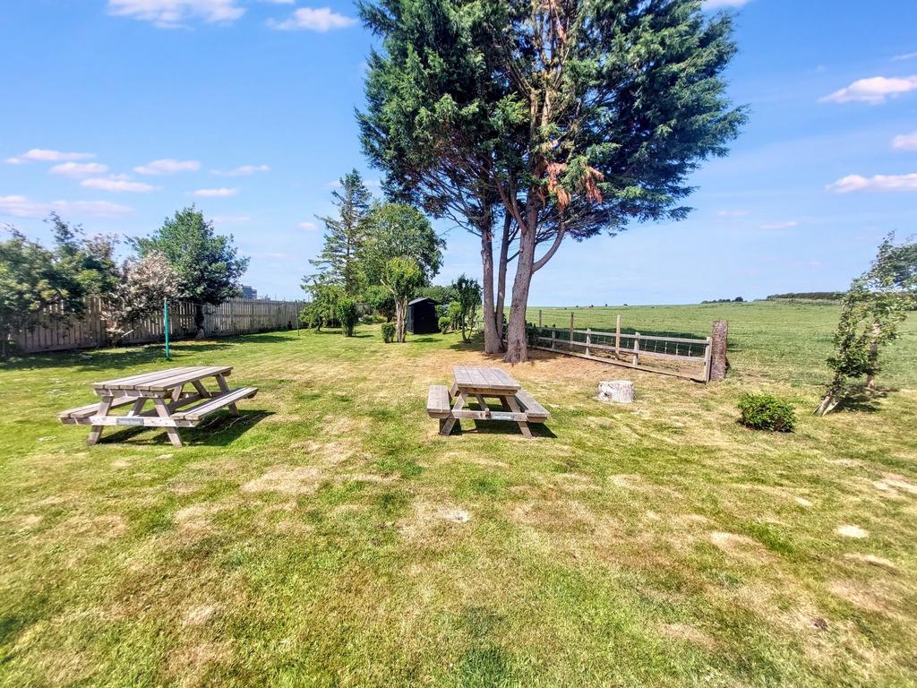A few mature trees offer gentle shade and enhance the garden’s tranquil ambiance, while the open gate in the background leads the eye to expansive countryside views beyond. This outdoor space is both functional and picturesque, perfect for families, pet owners, or anyone seeking a peaceful connection with nature.