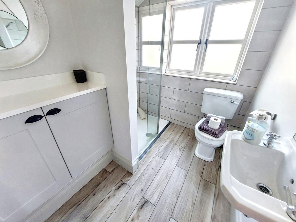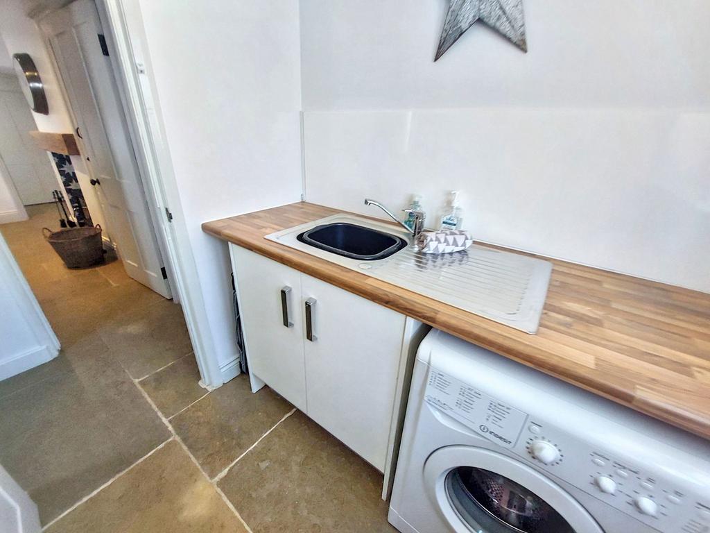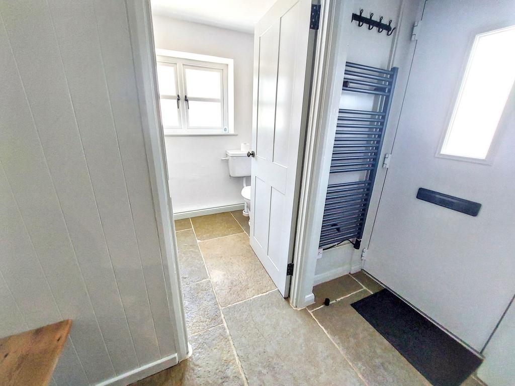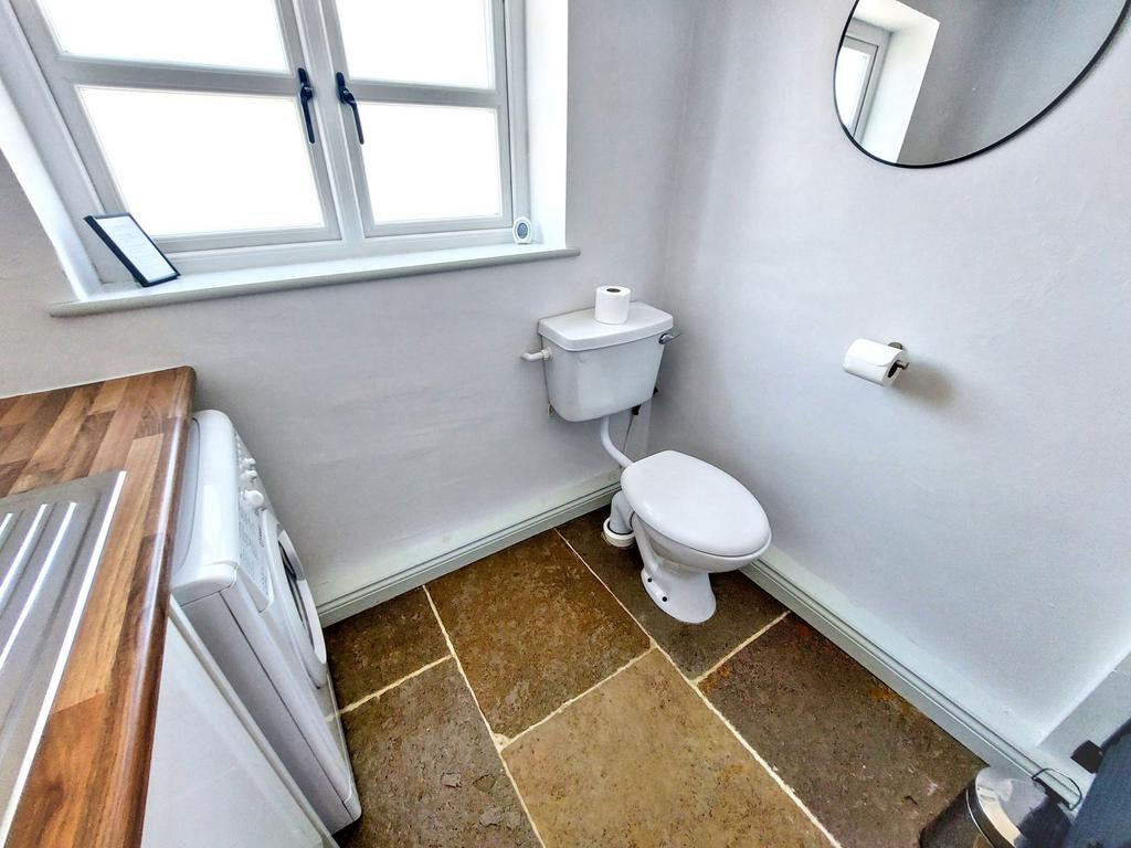 A compact and functional utility room that also serves as a secondary WC. The space is bright and clean, thanks to the large frosted window that allows in ample natural light while maintaining privacy. The walls are painted a crisp white, creating a fresh and airy feel. The flooring features rustic stone tiles that match the kitchen, lending continuity and a touch of country charm.