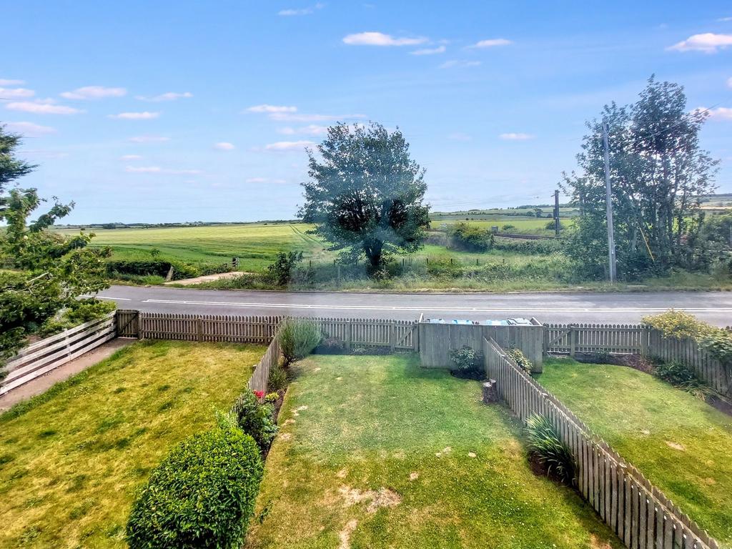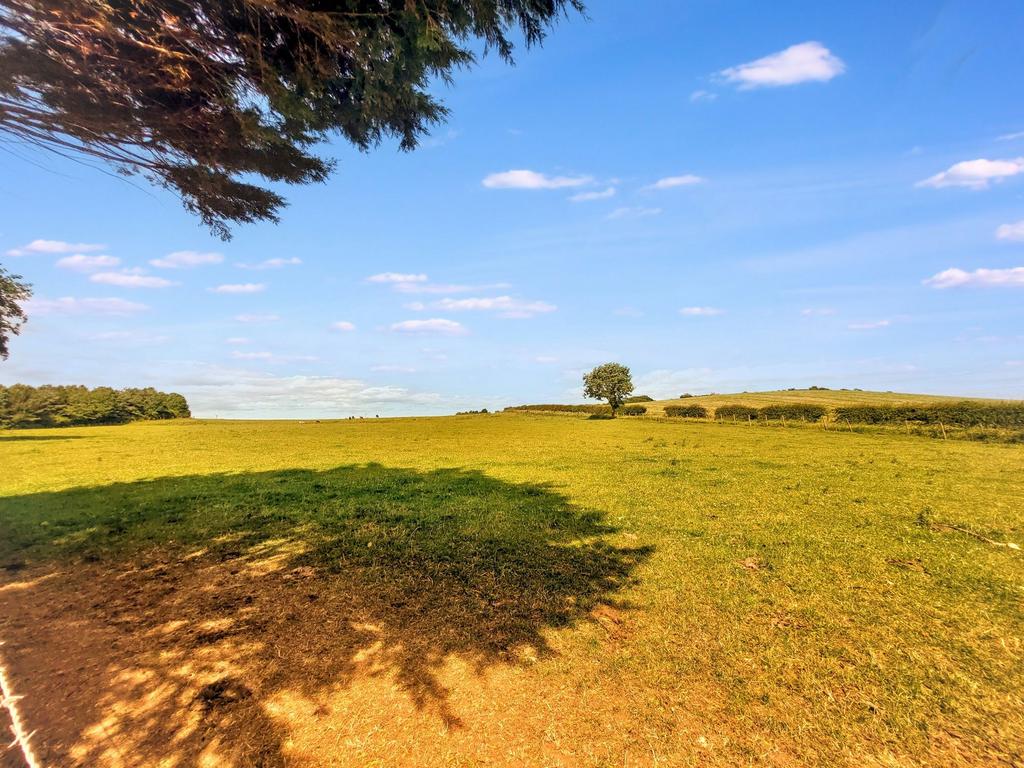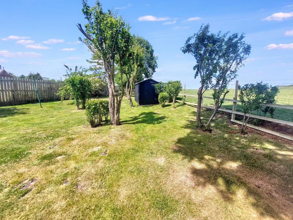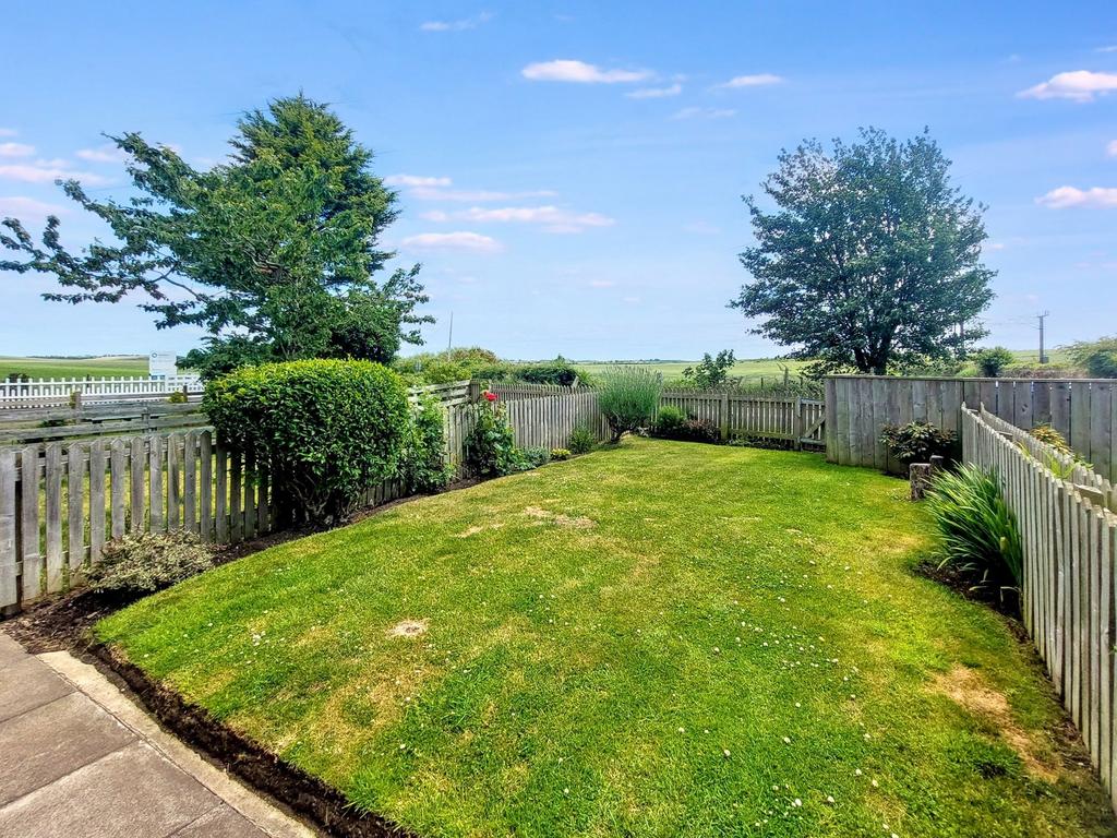 A spacious and sunlit rear garden with a peaceful, semi-rural setting. The lawn is expansive and well-maintained, bordered by a combination of wooden fencing and open wire fencing that offers unobstructed views of the rolling green fields beyond. Scattered throughout the garden are small trees and neatly trimmed bushes, creating a natural, inviting feel and offering pockets of shade.