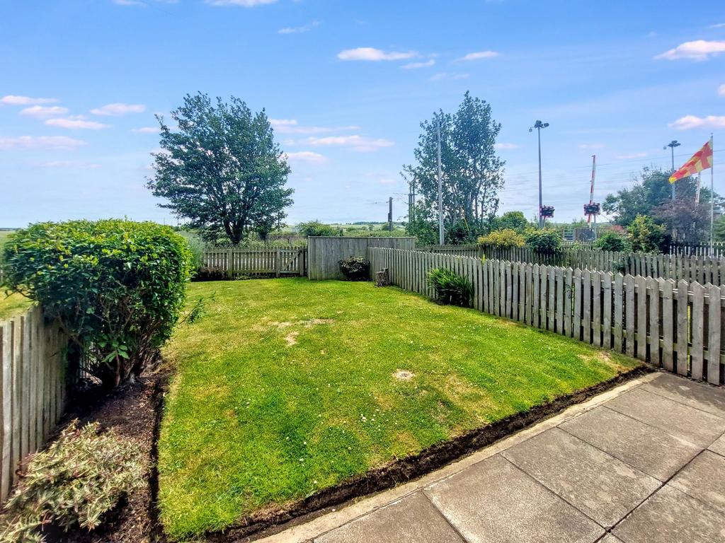 A charming and well-kept enclosed garden area, ideal for relaxation or light outdoor activities. The lawn is lush and green, bordered by a neat wooden picket fence that adds to the cottage-style appeal of the property. Well-maintained hedges, shrubs, and flowering plants line the perimeter, providing colour and natural privacy.