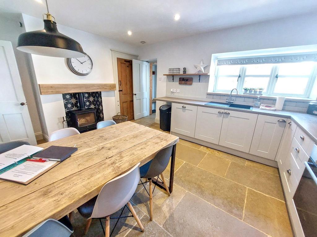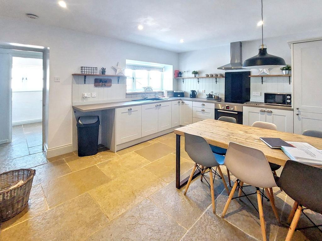 A bright and spacious country-style kitchen that combines traditional charm with modern functionality. The room features neutral tones and stone flooring, which adds rustic warmth and durability. The cabinetry is classic shaker-style in a soft grey finish, complemented by sleek countertops and modern stainless steel appliances, including an integrated oven, stovetop, and extractor hood.