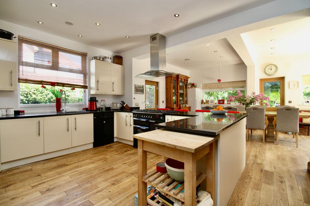 Behind its handsome façade, the house opens into a striking wood-panelled entrance hall that sets the tone for the space within—warm, inviting, and full of charm. The ground floor features two generous reception rooms, a cloakroom, and a spectacular open-plan kitchen and family area that forms the heart of the home. With garden views and ample space for entertaining, it's ideal for both everyday life and special occasions.
