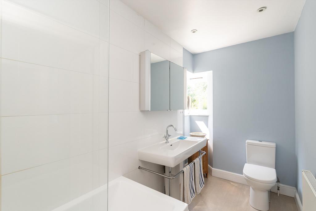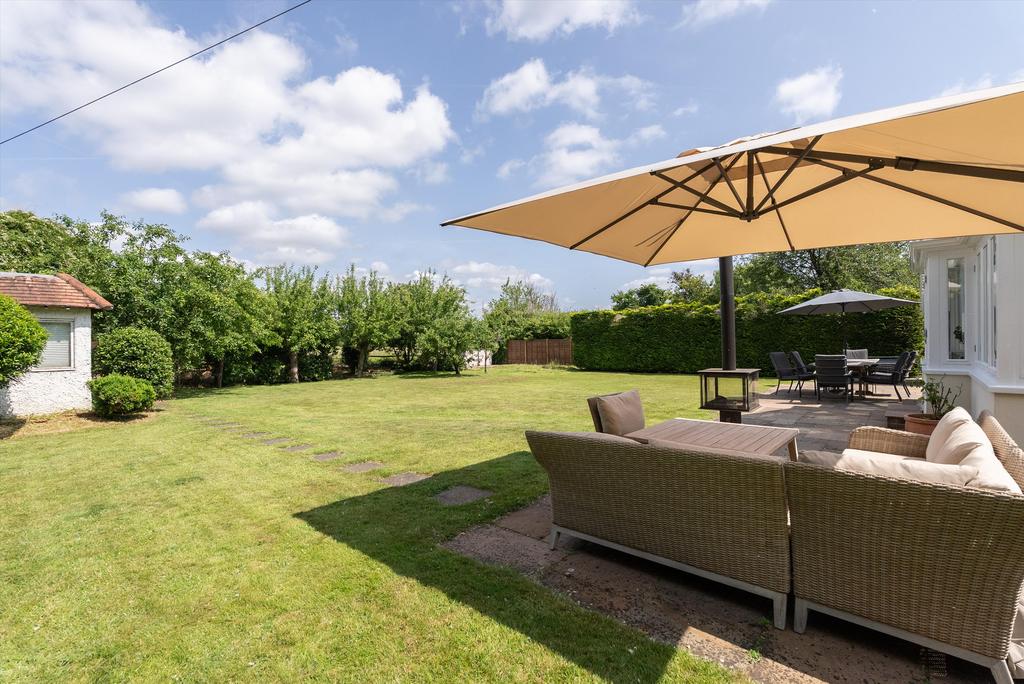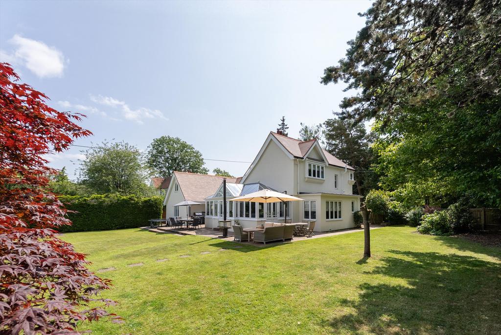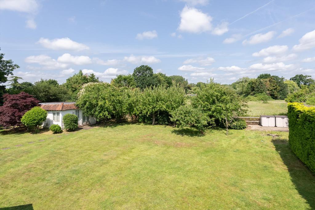 The large westerly facing garden has a wonderful green outlook and is mainly laid to lawn. The whole plot is 0.41 acres. It wraps around the left-hand side of the house and offers the perfect place for children to play. There is a large lateral terrace which is ideal for entertaining and al fresco dining. There is an outbuilding in the garden which could be set up as a gym or office.