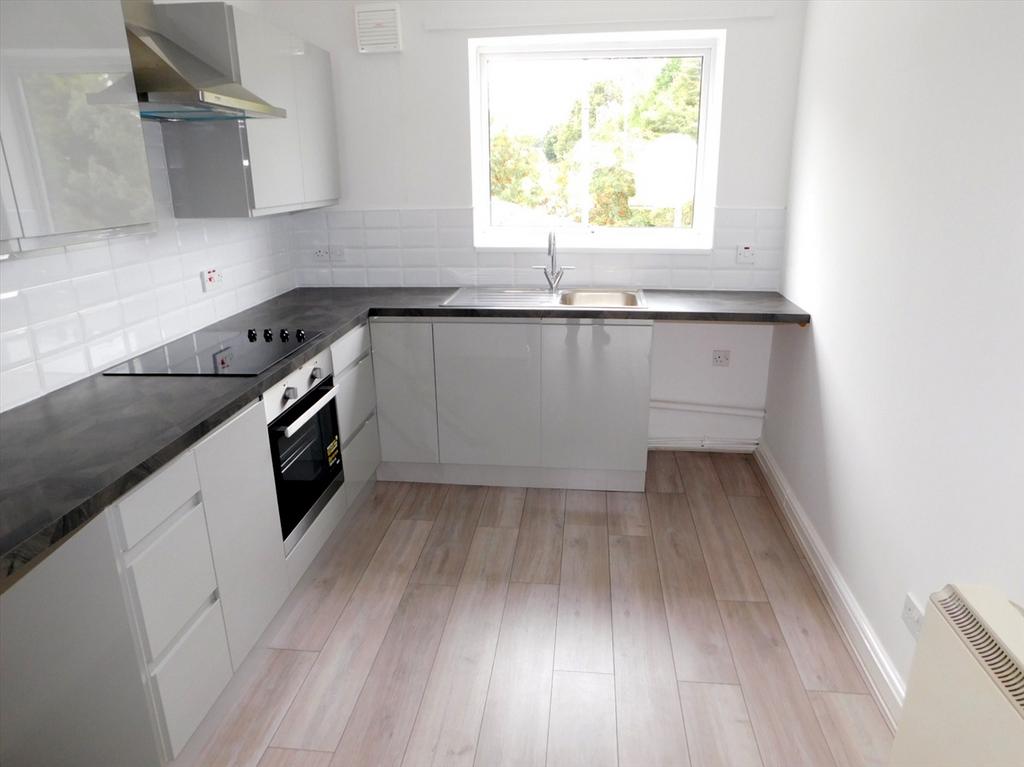 The newly fitted and well designed kitchen is located to the rear of the apartment and benefits from a range of base and wall units with complimenting work tops incorporating a stainless steel sink unit and drainer, an electric oven and a ceramic hob with an extractor hood above. The room has tiled splash backs, laminate flooring, an electric storage heater, a built in storage cupboard, plumbing for a washing machine and a PVC double glazed window to the rear aspect.