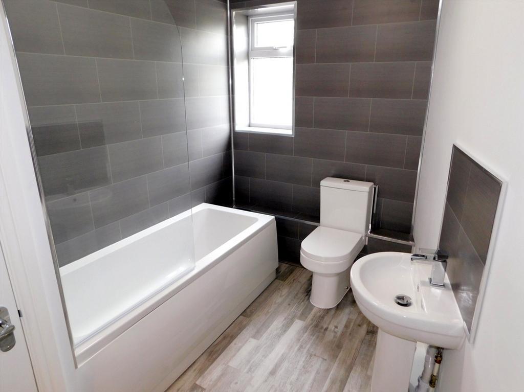 The recently fitted bathroom has a three piece suite comprising a low level WC, a pedestal hand wash basin and a panelled bath with a shower attachment. The room has laminate flooring, partly clad walls, an electric storage heater, an airing cupboard and an opaque PVC double glazed window to the rear elevation.