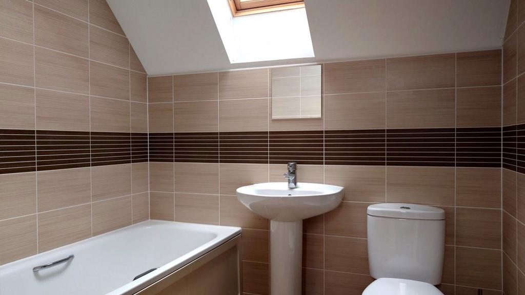 Family Bathroom Modern white bathroom suite including bath with handheld shower attachment, WC and pedestal sink, fully tiled with stone effect tiles and decorative border, Velux window, chrome heated towel rail, wood effect vinyl flooring.