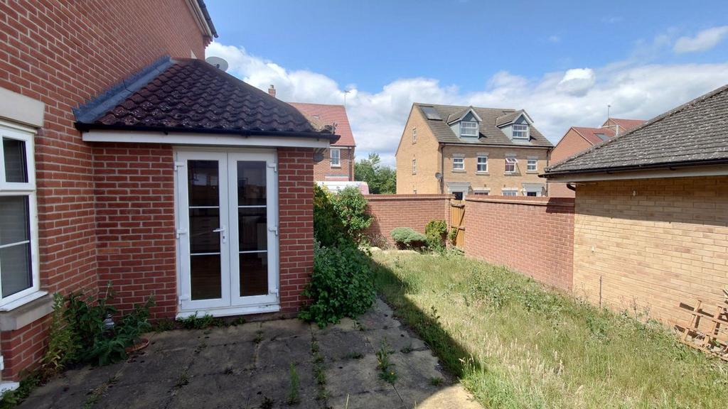 Externally Enclosed rear garden mostly laid to lawn with patio area, driveway parking with single garage.