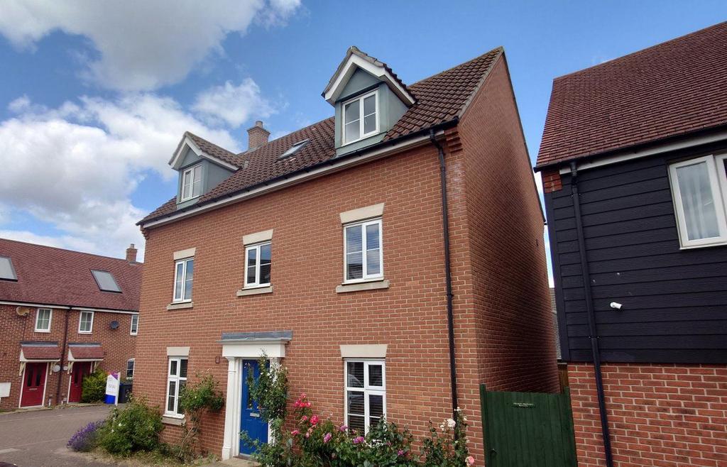 Hazells is proud to present this fabulous and spacious (1800 sq. FT) modern five bedroom family home on the ever popular and well served Moreton Hall Development, located ideally for Bury St Edmunds town centre and also offering easy access to the A14 for onwards travel. The property is also ideally suited for access to RAF Lakenheath and RAF Mildenhall. The generous accommodation is spread out over three floors, on the ground floor you will find a good sized welcoming entrance hallway, with WC, a large dual aspect lounge, modern fitted kitchen with space for a breakfast table, and separate dining room, the first floor contains a large master bedroom with built in wardrobes and en-suite, a second bedroom with en-suite and a smaller fifth bedroom which would make a perfect nursery, child's bedroom or study. On the top floor there are two further double bedrooms, which share the family bathroom in between. Externally there is a fully enclosed garden mostly laid to lawn, with a gate leading to the driveway and single garage. Gas fired central heating, fully UVPC double glazed with an excellent EPC rating of "B". Early viewing is highly recommended as this is sure to be a popular house in a sought after area.