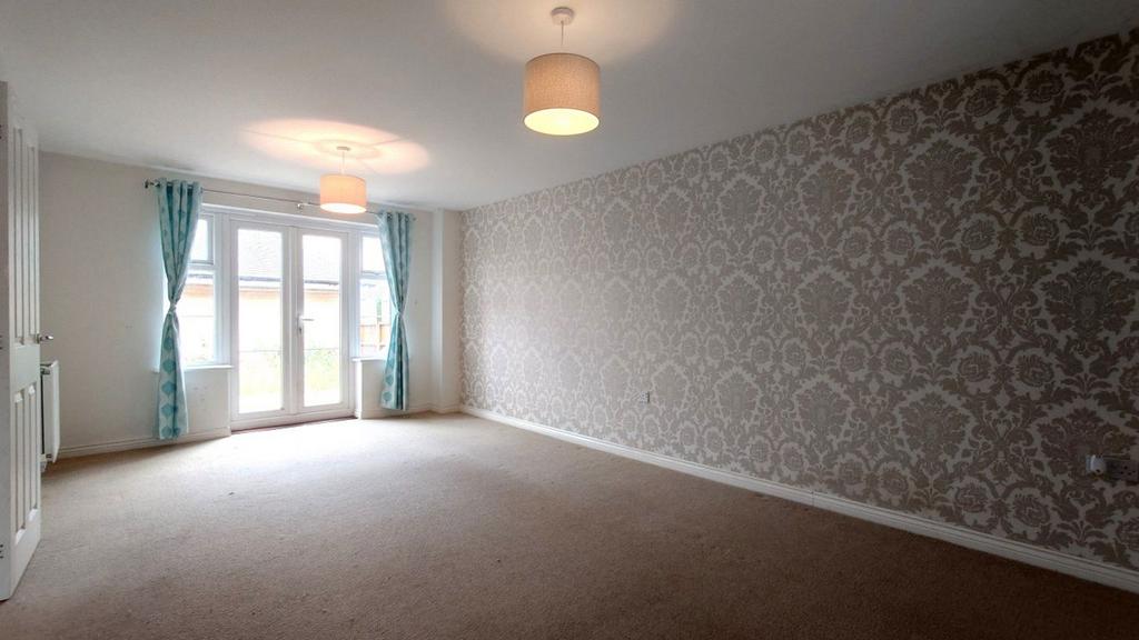 Lounge 11ft2 x 19ft2 - Window to front with curtains and blinds, french doors to rear with curtain, carpeted, feature wallpaper, radiators.
