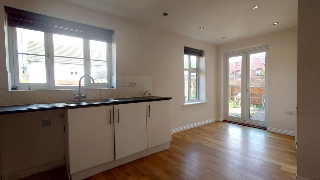 Kitchen Window to rear with blind, glazed door to side with blind, patio door to garden, modern white fully fitted kitchen with range of wall and floor units, space for washing machine, space for dishwasher, granite effect worktop with inset stainless steel sink, stainless steel hob and double oven with extractor above, tiled splashback, radiator, LVT flooring.