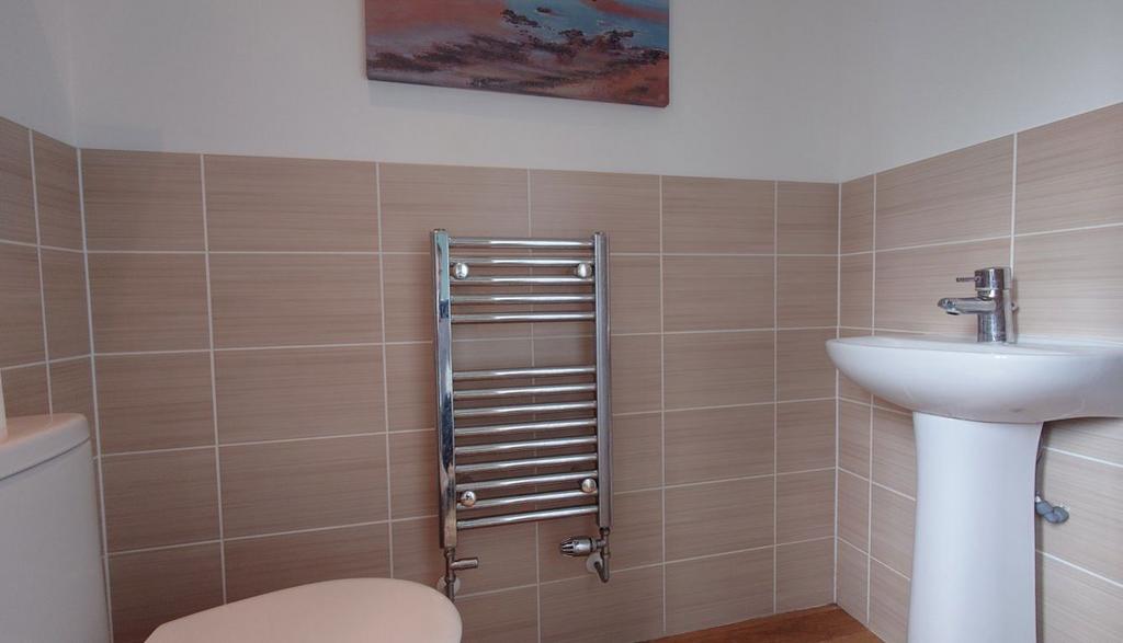 Bedroom Two Ensuite Fully tiled with stone effect tile and decorative border, large shower enclosure with glass screen and thermostatic mixer shower, modern white WC and pedestal sink, window to rear with privacy glass, chrome heated towel rail, wood effect vinyl flooring.