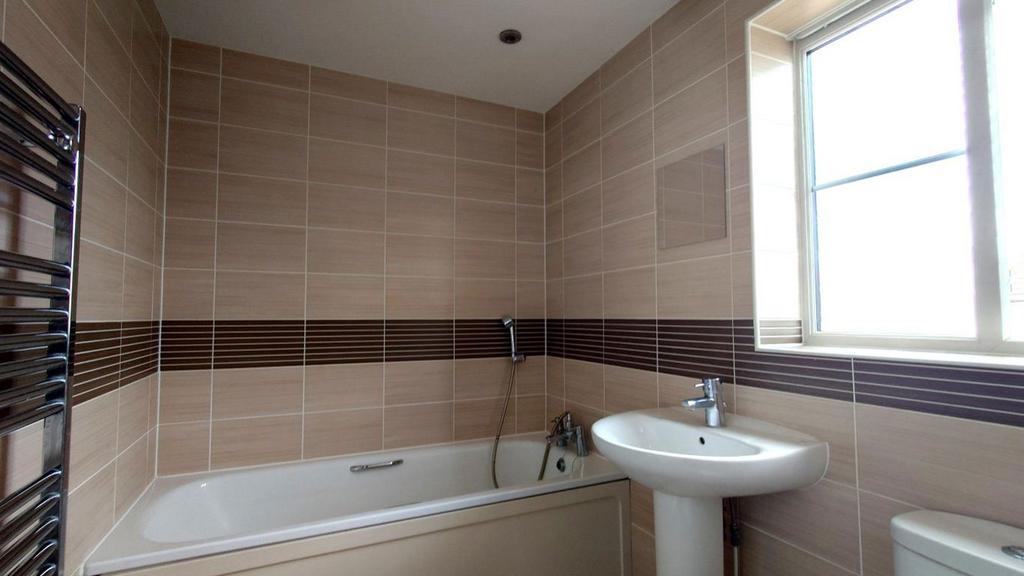 Bedroom One Ensuite Modern white bathroom suite including bath with handheld shower attachment, WC and pedestal sink, fully tiled with stone effect tiles and decorative border, window to rear with privacy glass, chrome heated towel rail, wood effect vinyl flooring.