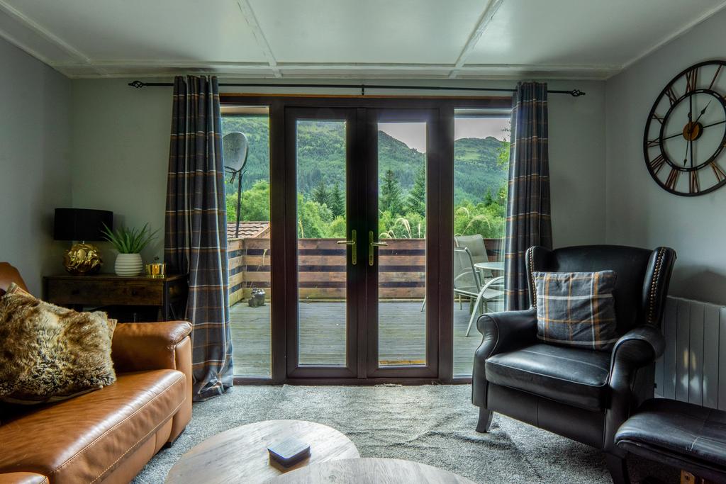Enter the lodge through Double French doors, with glass panels either side, flooding the room with natural light. There's an electric faux log fireplace with marble surround and a wood mantle. All year heating is assured with the electric storage heaters. This cosy and sociable open plan living has defined lounge and kitchen areas. The carpeted lounge is front facing with an outlook towards Loch Eck and the rolling hills and has space for a table and chairs.