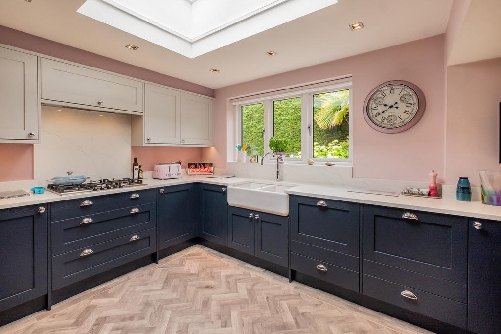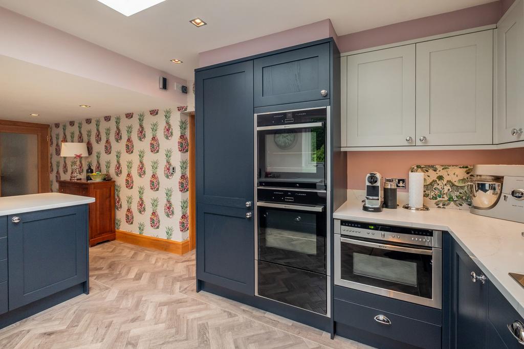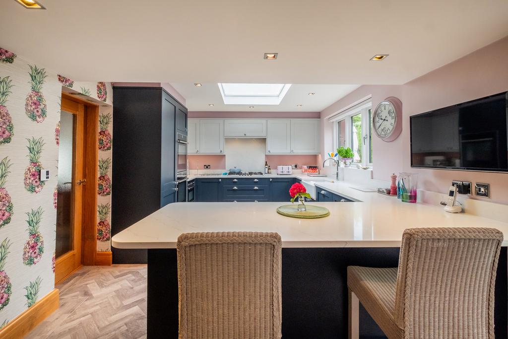 Double glazed windows and external door to the rear. Sky lantern affording plenty of natural light. Range of fitted wall and base units incorporating breakfast bar, Quartz work surfaces and matching splashbacks, and large ceramic double bowl sink with Quooker instant boiling mixer water tap. Integrated appliances include: two large dishwashers, Neff double oven/grill, Neff large warming drawer, Neff microwave combi oven, Neff 5 ring gas hob with illuminated extractor above, and fridge freezer. Karndean flooring, spot lighting, large pantry cupboard and TV aerial point.