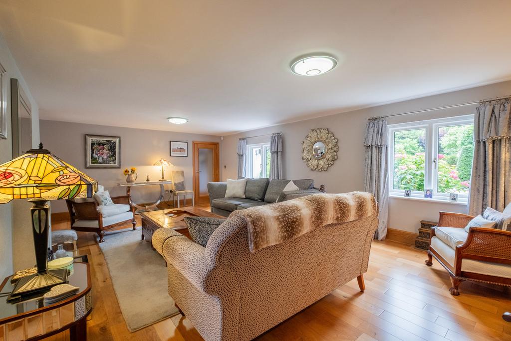 Obscure glazed oak doors form the lounge. Double glazed external French doors and windows to the rear. Sky lantern, Karndean flooring, spot lighting, TV aerial point and fitted storage/display cabinets.