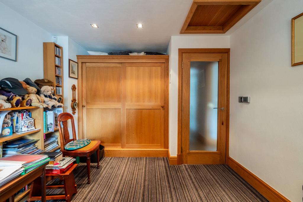 Double glazed windows to the front and side. Oak flooring, spot lighting, ceiling light and fitted mirrored shelving. Door to:
