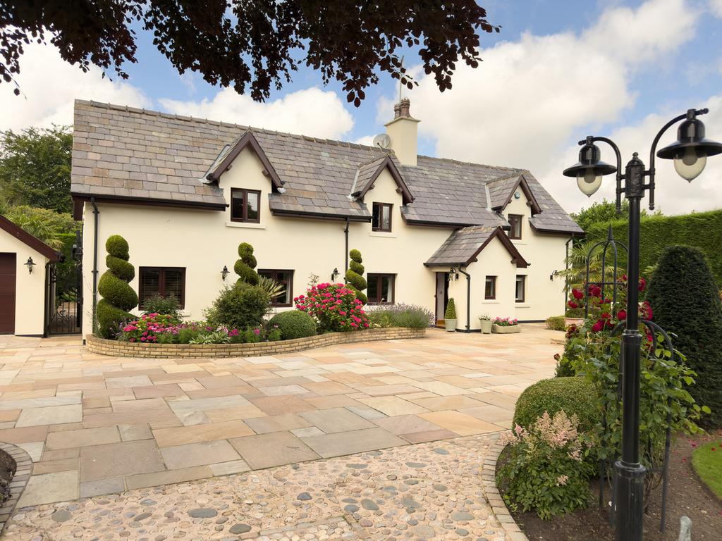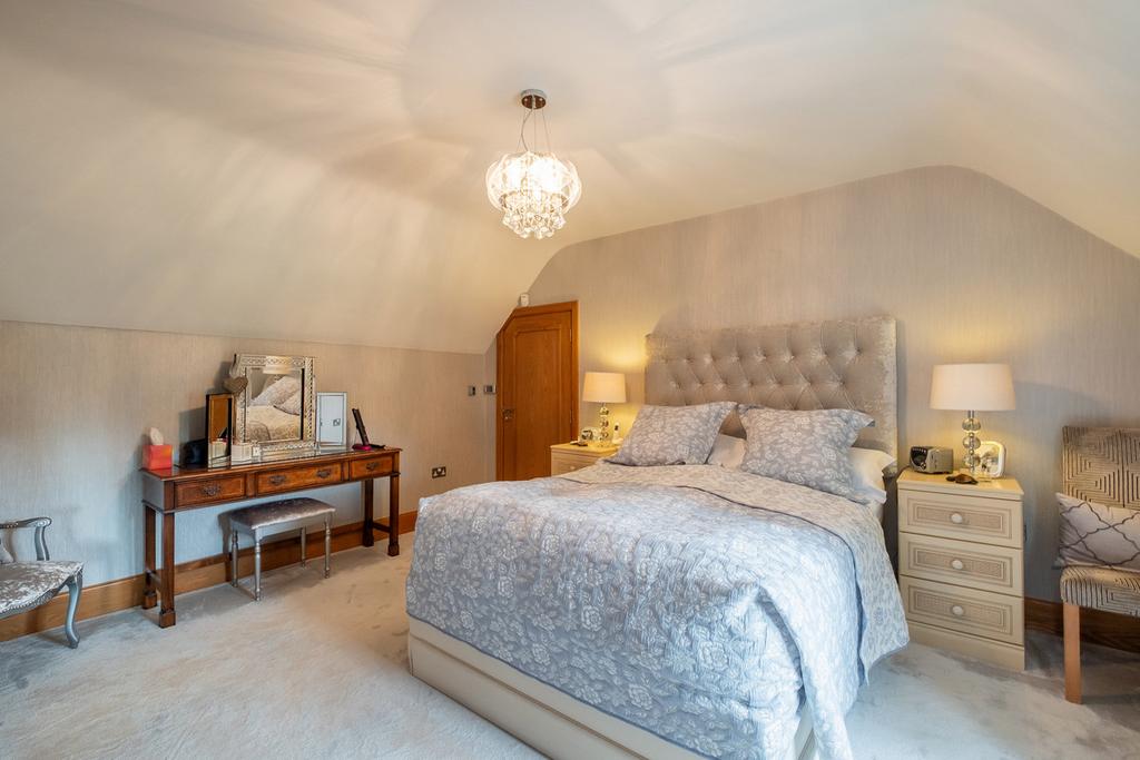 To the front, the property is approached via Secure gated driveway with lighting, providing ample off road parking. Stunning private front garden with privacy hedging, paved patio areas, large private well manicured lawns. well stocked plants, mature trees and shrubbery.