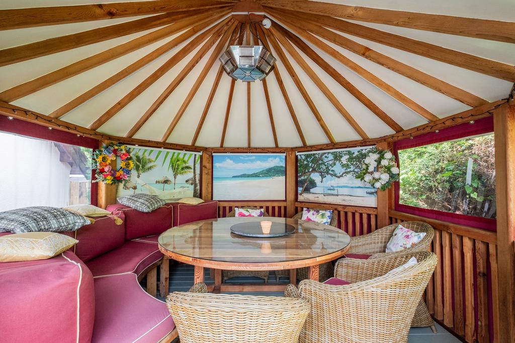 Paved patio area with raised summer house sheltered with power and heater. Fitted seating and round table.