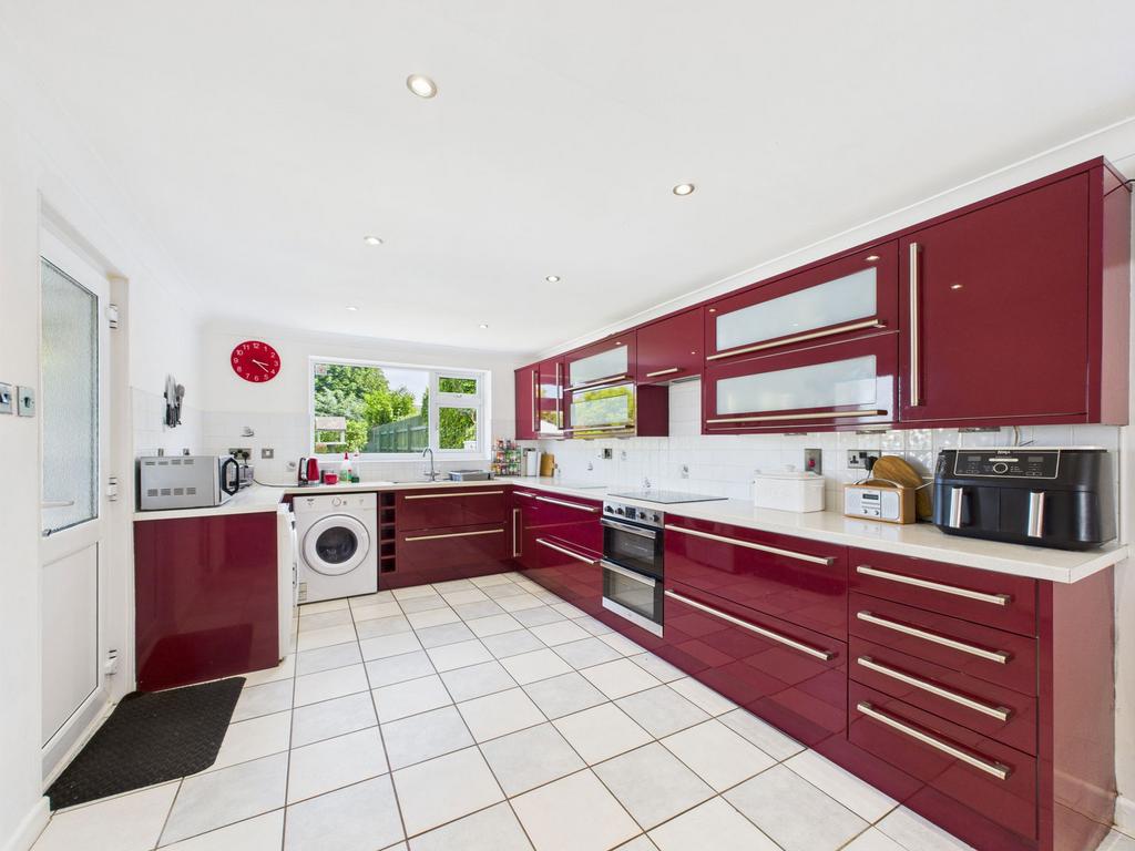 A very large kitchen/diner ideal for entertaining done to a high standard with burgundy luxury fitted kitchen with an extensive range of wall and base units with integrated electric oven, hob and hood. Sink under window facing out to beautiful sunny south facing garden, space for washing machine, dryer and fridge freezer. uPVC window facing the front of the property, uPVC back door leading onto patio and back garden. Radiators. Ceramic tiled floor.