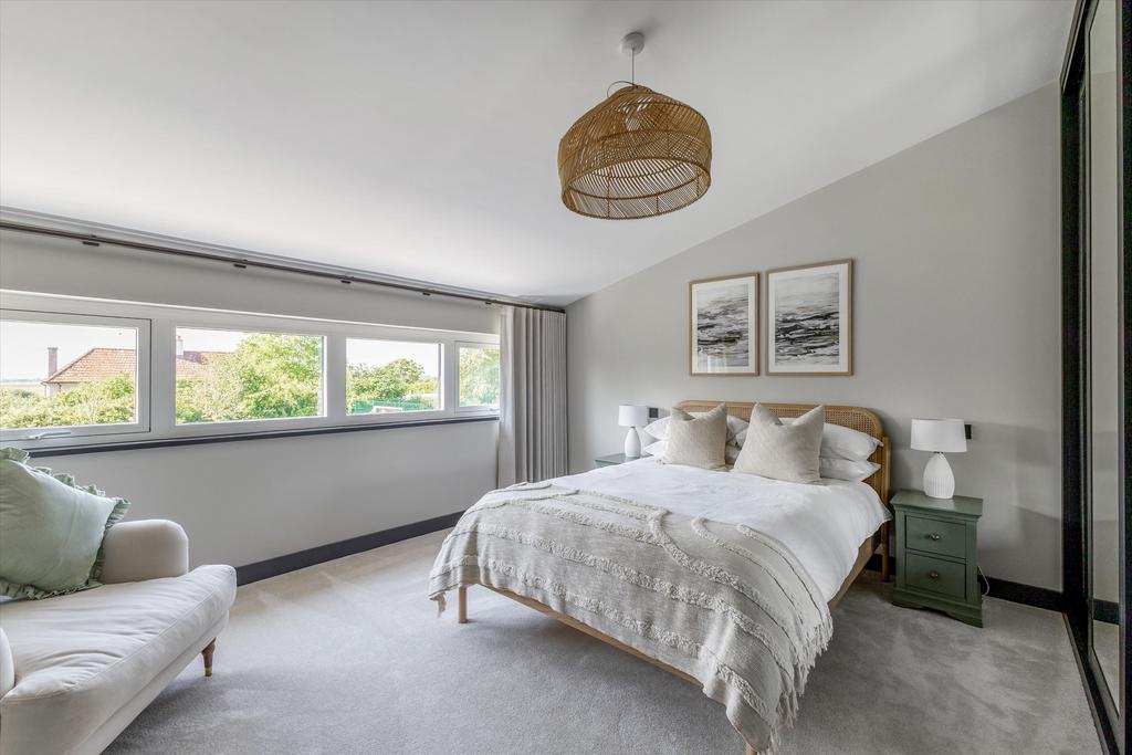 Upstairs, the principal bedroom enjoys a beautiful dual aspect with a private south-facing terrace. It includes a lavish en suite bathroom with a separate shower and a fully fitted dressing room. There are three further guest bedrooms: one with an en suite shower and private terrace, and two with built-in wardrobes served by a sleek, contemporary family bathroom.