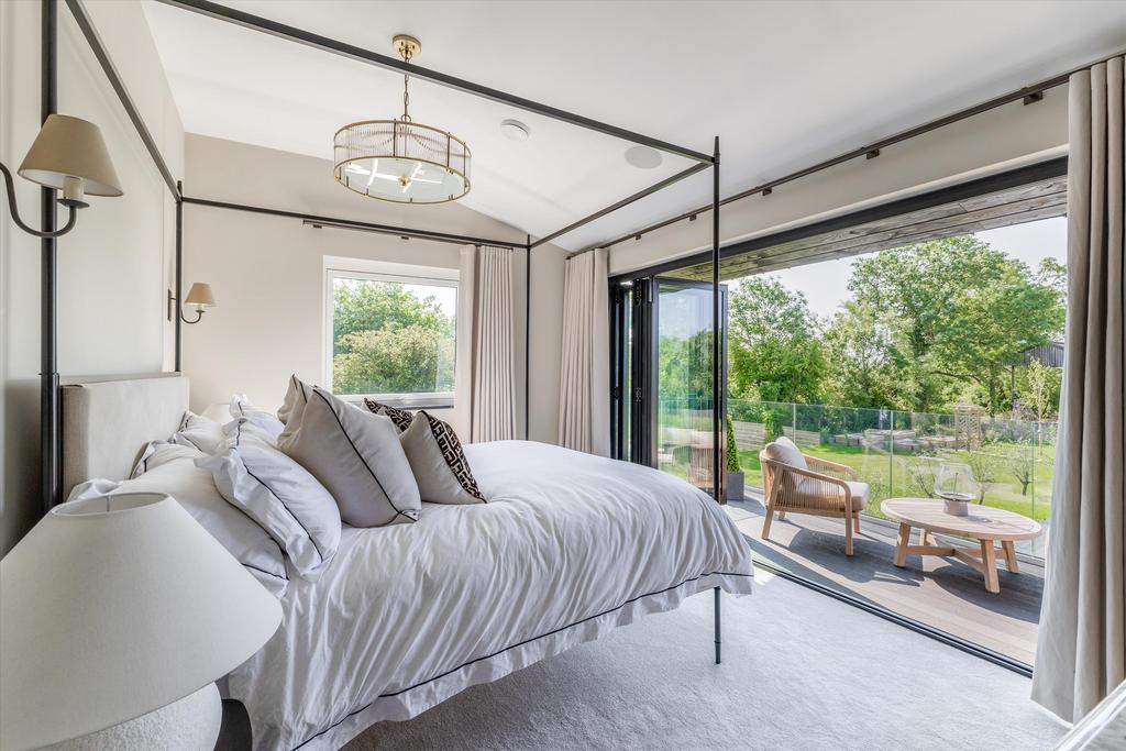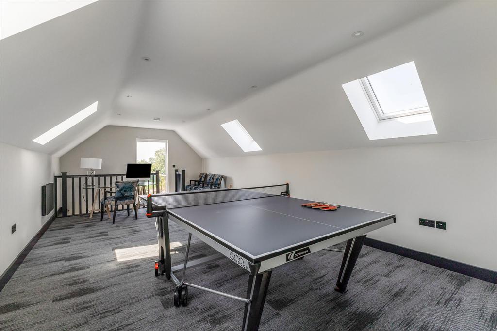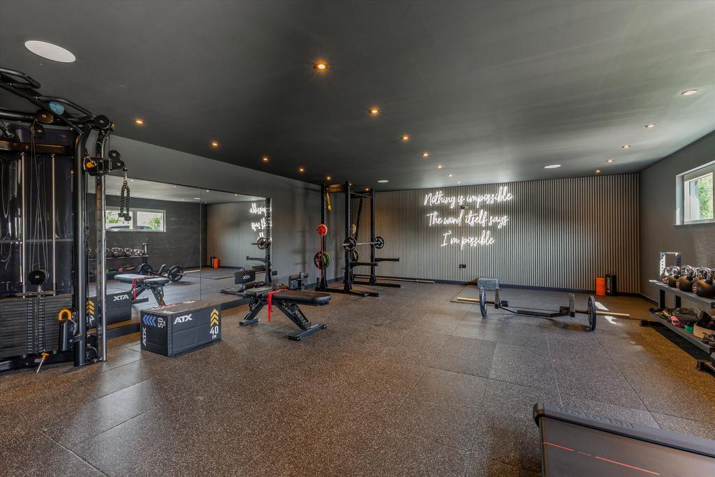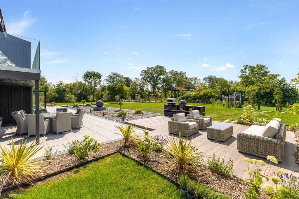Accessed via electric gates and a sweeping driveway, the gardens are level, sunny and private, wrapping around the home to create a serene setting. The grounds feature expansive lawns, a sun terrace, and a variety of mature trees and shrubs, providing year-round colour and interest. To one side, there is a superb, enclosed football pitch. The current owners have transformed the double garage into a stylish home gym, with a versatile study or games room above.