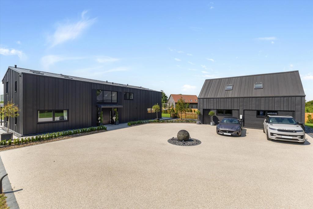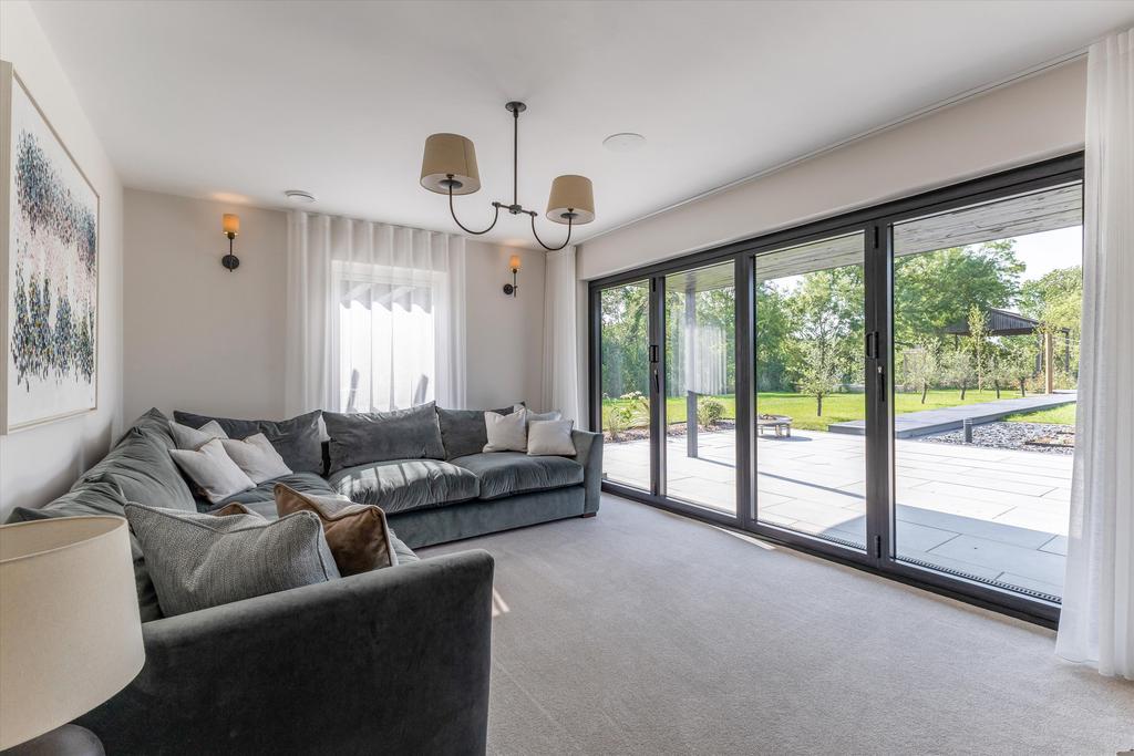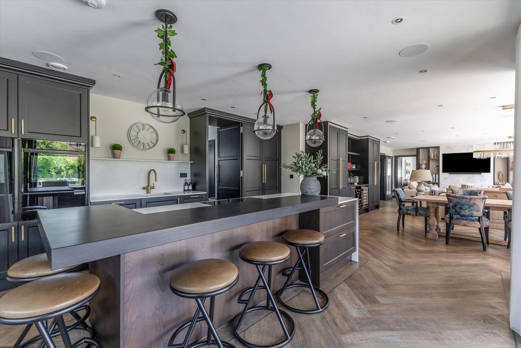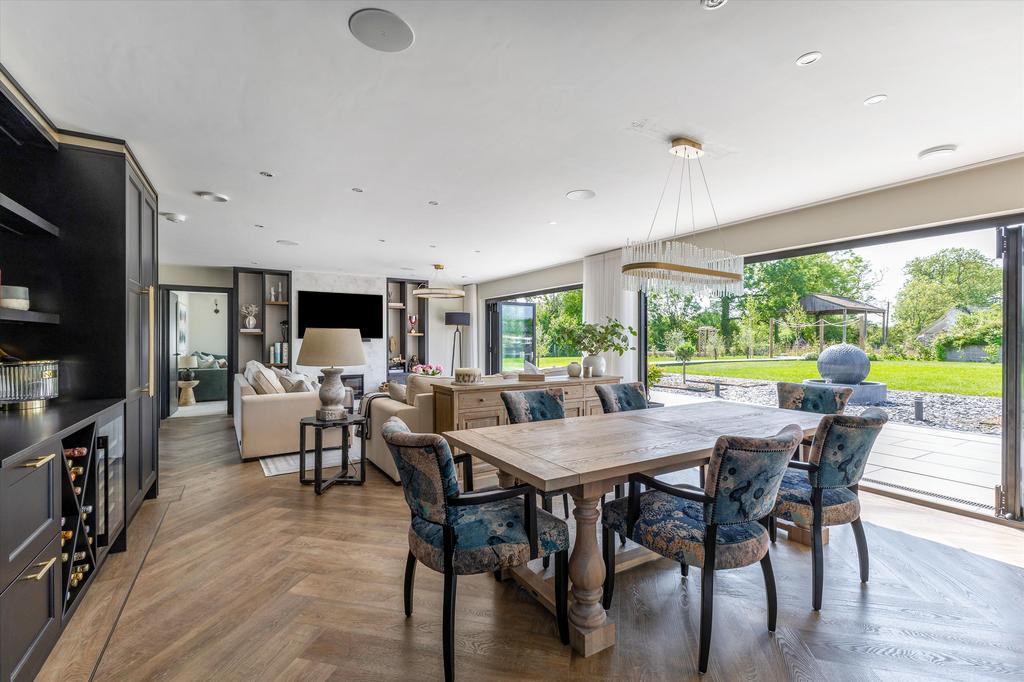 Harmony House is an exceptional, detached modern family home, recently completed by the current owners using the highest quality materials throughout. This striking contemporary home is designed to maximize natural light and storage, with breathtaking views over its private, purposefully landscaped gardens. At the heart of the home lies a stunning open-plan kitchen, living, and dining space. Spanning nearly 46 feet in width, this impressive, light-filled room is almost entirely glazed on its south-facing side, creating an airy, welcoming environment ideal for entertaining. The state-of-the-art kitchen features a range of premium integrated appliances, a generous central island, and a discreet, practical utility room. The living and dining areas flow seamlessly together and open effortlessly onto the outdoor space, offering zones for both formal dining and relaxed lounging. From the spacious and striking entrance hall, you'll find a luxurious cinema room and an additional sitting room, which extends from the kitchen-diner and benefits from bifold doors leading directly to the rear garden.