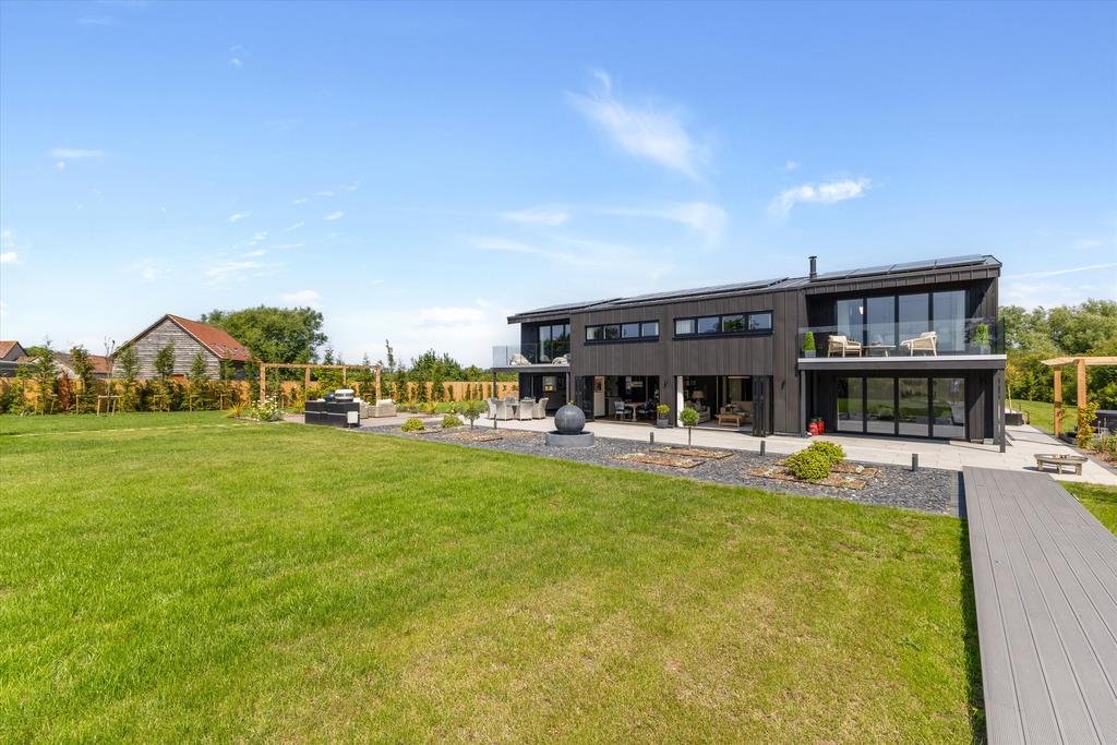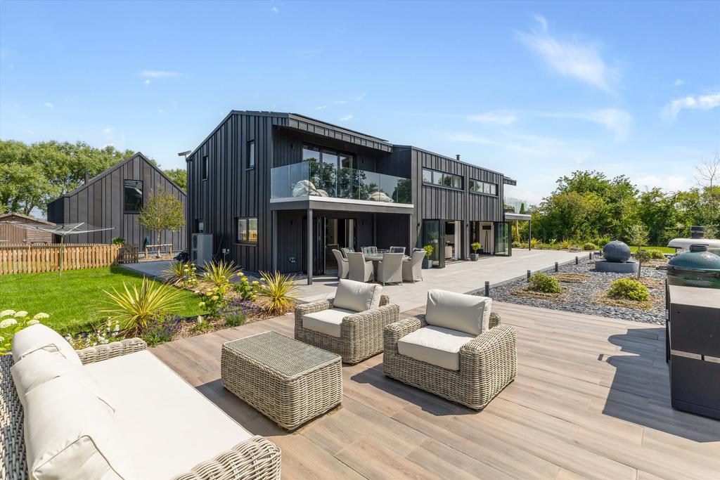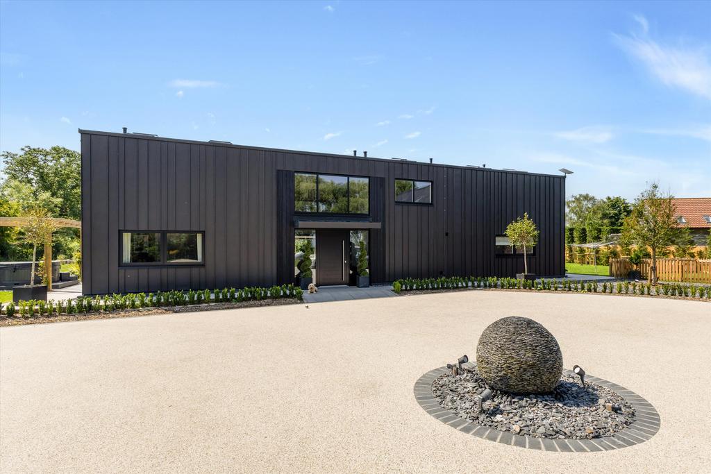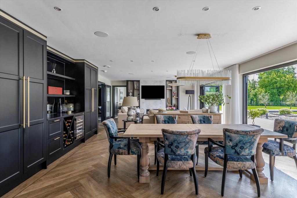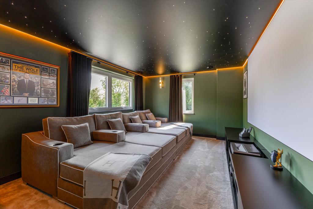 Harmony House is an exceptional, detached modern family home, recently completed by the current owners using the highest quality materials throughout. This striking contemporary home is designed to maximize natural light and storage, with breathtaking views over its private, purposefully landscaped gardens. At the heart of the home lies a stunning open-plan kitchen, living, and dining space. Spanning nearly 46 feet in width, this impressive, light-filled room is almost entirely glazed on its south-facing side, creating an airy, welcoming environment ideal for entertaining. The state-of-the-art kitchen features a range of premium integrated appliances, a generous central island, and a discreet, practical utility room. The living and dining areas flow seamlessly together and open effortlessly onto the outdoor space, offering zones for both formal dining and relaxed lounging. From the spacious and striking entrance hall, you'll find a luxurious cinema room and an additional sitting room, which extends from the kitchen-diner and benefits from bifold doors leading directly to the rear garden.