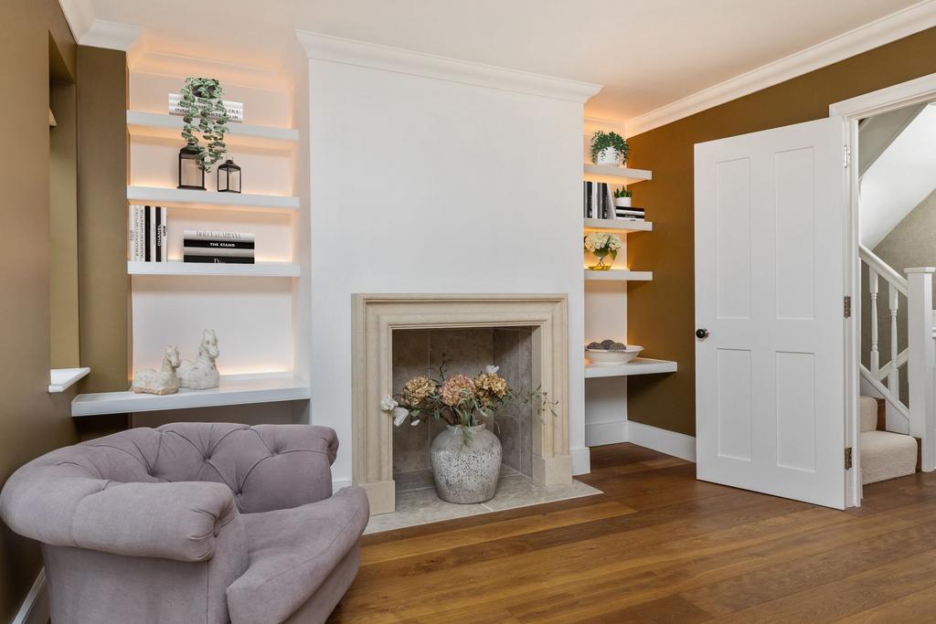 On the first floor, you’ll find a spacious double bedroom with bespoke fitted wardrobes, leading to a luxurious Jack and Jill bathroom. Impeccably finished, this bathroom offers a 'boutique hotel' feel, with illuminated niches, mirrored cabinetry, and a stunning freestanding bath. Also on this floor is the formal lounge, featuring a charming bay window, a feature fireplace with custom shelving, and tranquil river views.