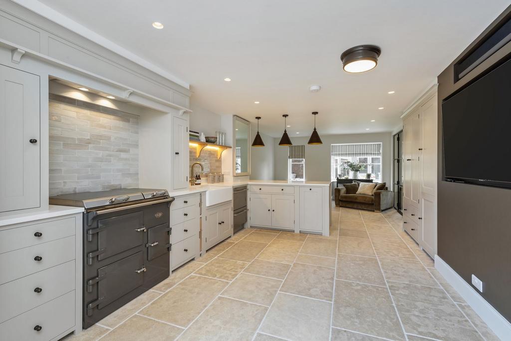 Upon entering, you’re welcomed into an interior-designed entrance hall featuring floor-to-ceiling Crittall-style glass doors, setting the tone for the exquisite design found throughout. This leads to a fabulous open-plan kitchen and living space, ideal for entertaining. The bespoke, hand-painted Neptune kitchen is finished in a classic in-frame Shaker style and boasts an array of integrated appliances and a stylish breakfast bar. This area opens out onto a private terrace, ideal for alfresco dining, with spectacular views of the castle, a truly magical spot to unwind or entertain.
