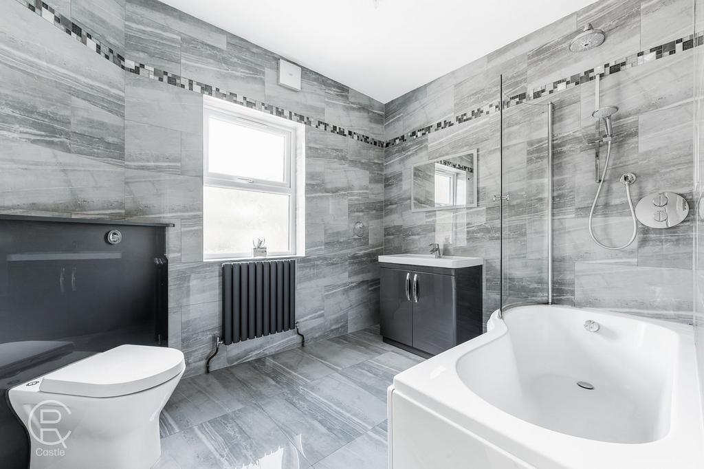 Rear aspect double glazed window, panel enclosed bath with shower, vanity wash hand basin, low level WC, radiator, tiled walls and floor extractor fan