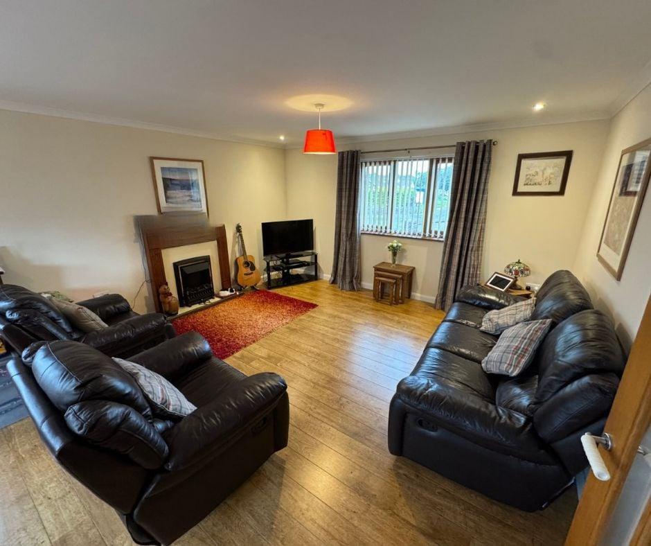 14' 4" x 23' 1" (4.37m x 7.04m) large family living room with window to front and side, sliding patio door to rear garden, electric fire with timber surround, wood effect flooring, multiple sockets.