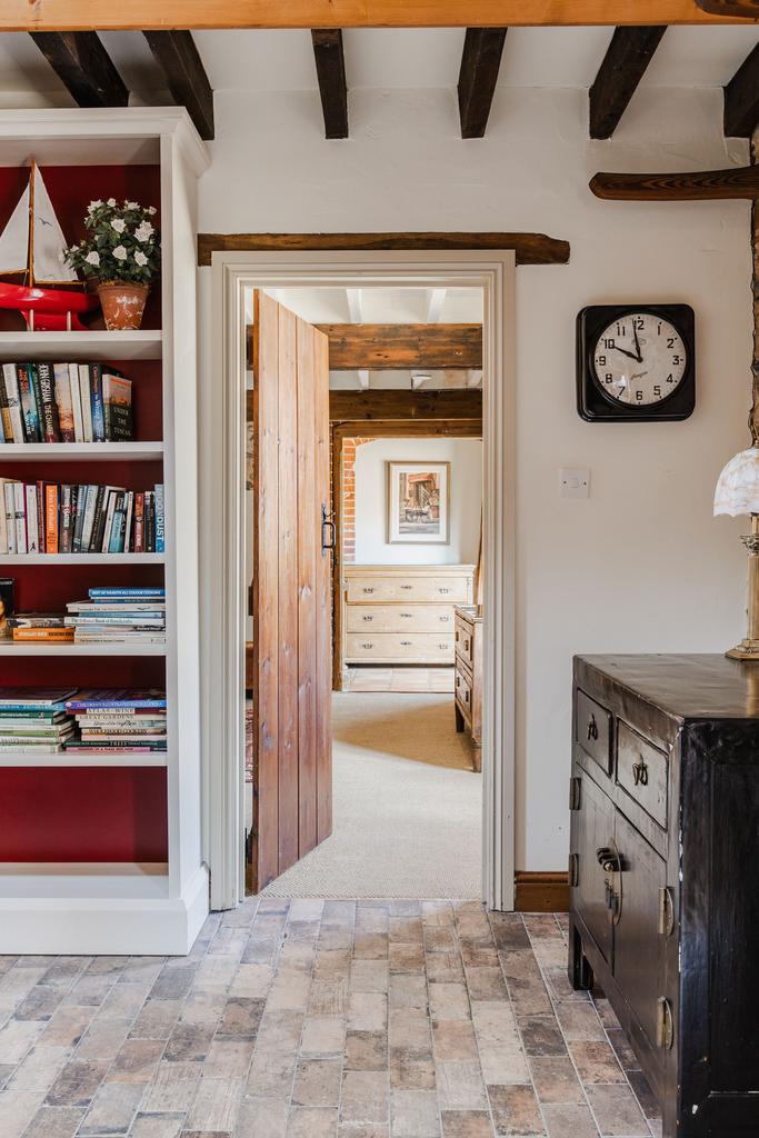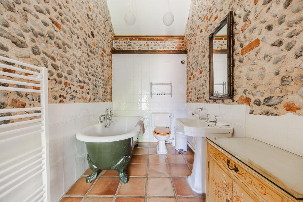 The combined sitting, dining and kitchen area embraces the theatre and drama of the building with vaulted and beamed ceilings, rustic brick floors and exposed flint walls. A wood burning stove rises through the room to create a focal point and a cosy atmosphere.