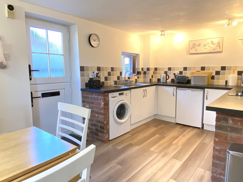 Kitchen/Dining Room 14' 11" x 9' (4.55m x 2.72m) (Side and rear aspect) Fitted with a range of gloss white fronted base units, working surfaces over, matching wall units, tiled splashback, single bowl, single drainer sink with mixer tap, space and plumbing for a washing machine, electric oven, electric hob and brushed stainless steel extractor hood over, part tiled walls, space for fridge, uPVC stable door to rear courtyard, two wall lights, adjustable ceiling spotlights, telephone and broadband connection, attractive wood effect vinyl flooring.