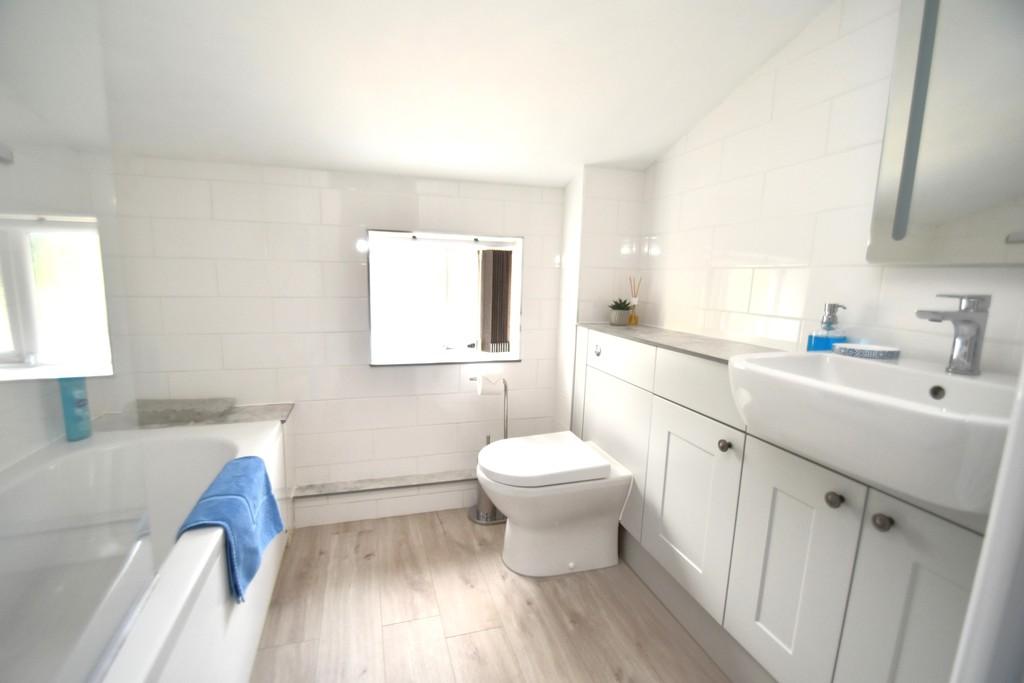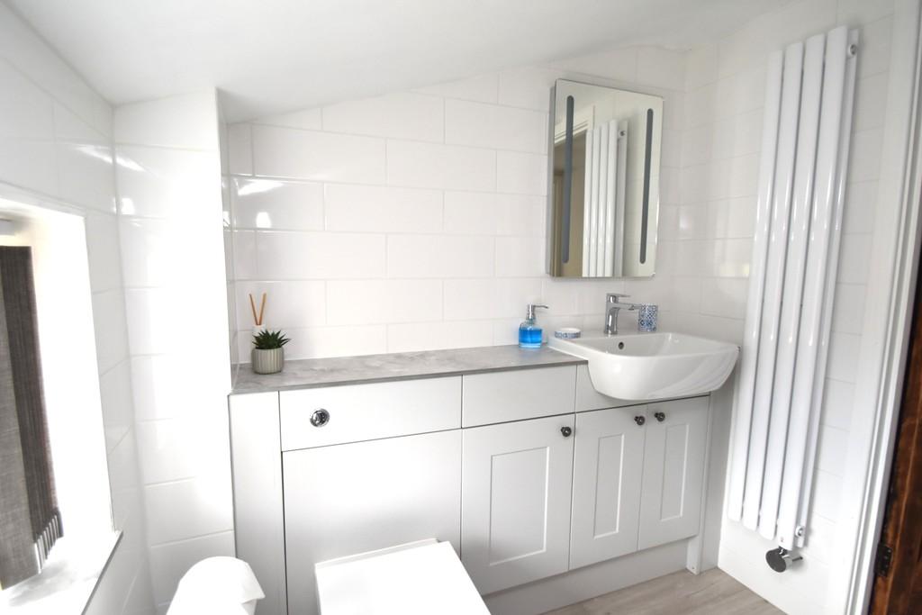 Bathroom 7' 4" x 6' 4" (2.24m x 1.93m) (Rear Aspect) Attractively fitted with a white contemporary suite comprising panelled bath with mixer tap, pop-up waste, independent Triton shower and shower screen, vanity handbasin with mixer tap, pop-up waste and cupboards under, low level WC with concealed cistern, tiled walls, feature tall radiator, sloping ceiling, attractive wood effect vinyl flooring.