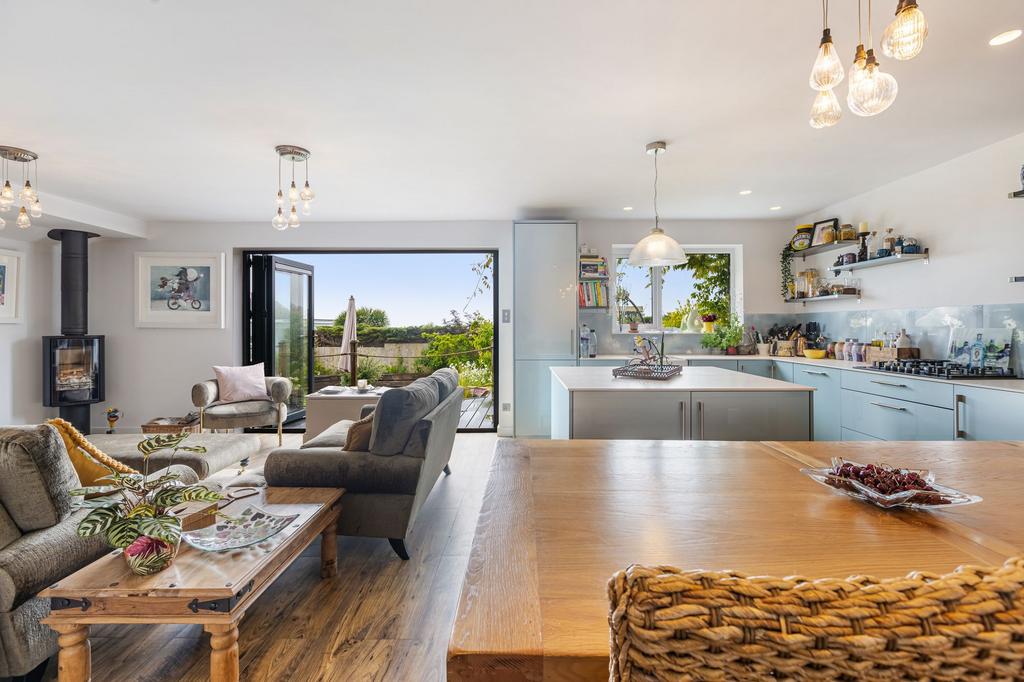 From the driveway three steps rise to a front door opening to the ENTRANCE PORCH with inner door leading to the bright and spacious OPEN PLAN PRINCIPAL ROOM with wood effect flooring which is followed throughout the property. The kitchen area is beautifully appointed with a range of gloss finish units in blue with island unit, pantry style cupboard and work tops with inset sink unit. Built-in double oven and microwave, five ring gas hob, integrated dishwasher, fridge and freezer. Window overlooking the garden. The sitting room area features a corner wood burning stove and bi-folding doors opening to the sunny rear garden with sea views. Off the entrance porch is a UTILITY with provisions for washing machine, work top with inset sink and door to the rear garden.