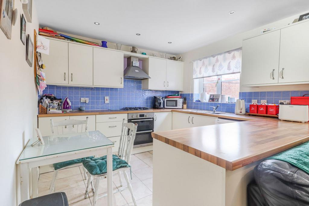 A modern fitted kitchen diner with an array of wall and base mounted units with work surface over, an integrated electric oven and gas hob with extractor, a window to the rear and space and plumbing for a washing machine.